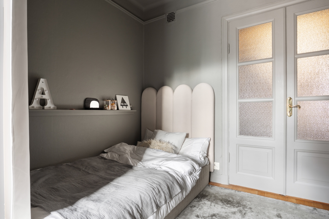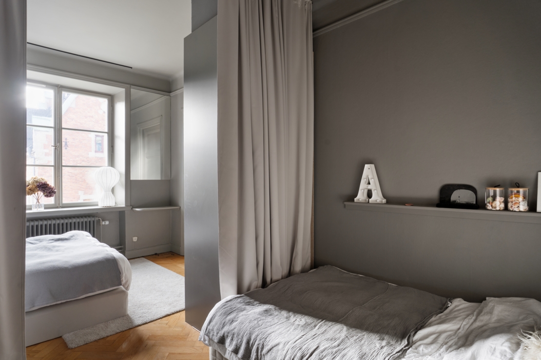 De två sovrummen är placerade med omtanke för både lugn och integritet, med plats för stora sängar, förvaring och personlig inredning.