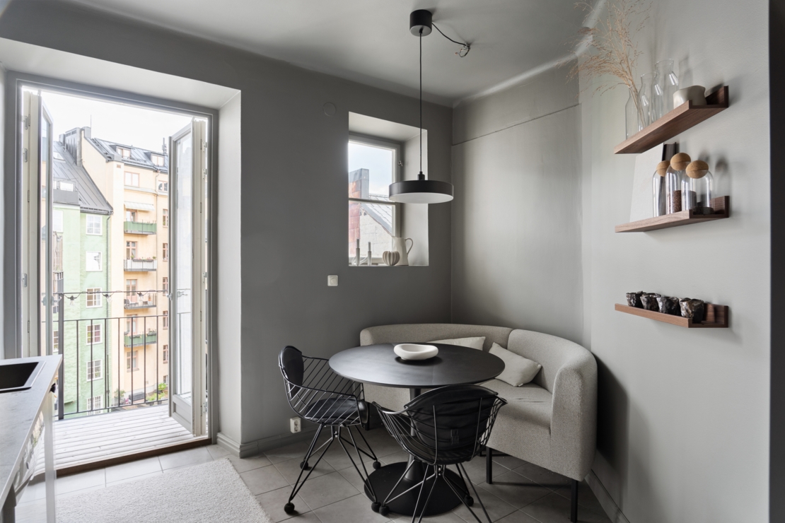 Köket är både funktionellt och smakfullt, med gott om förvaring och arbetsyta. Den högt belägna balkongen blir en naturlig förlängning av rummet och erbjuder en perfekt plats för morgonens första kaffe eller ett glas vin i kvällssolen efter en lång dag – en stillsam stund att dela med den man tycker om.