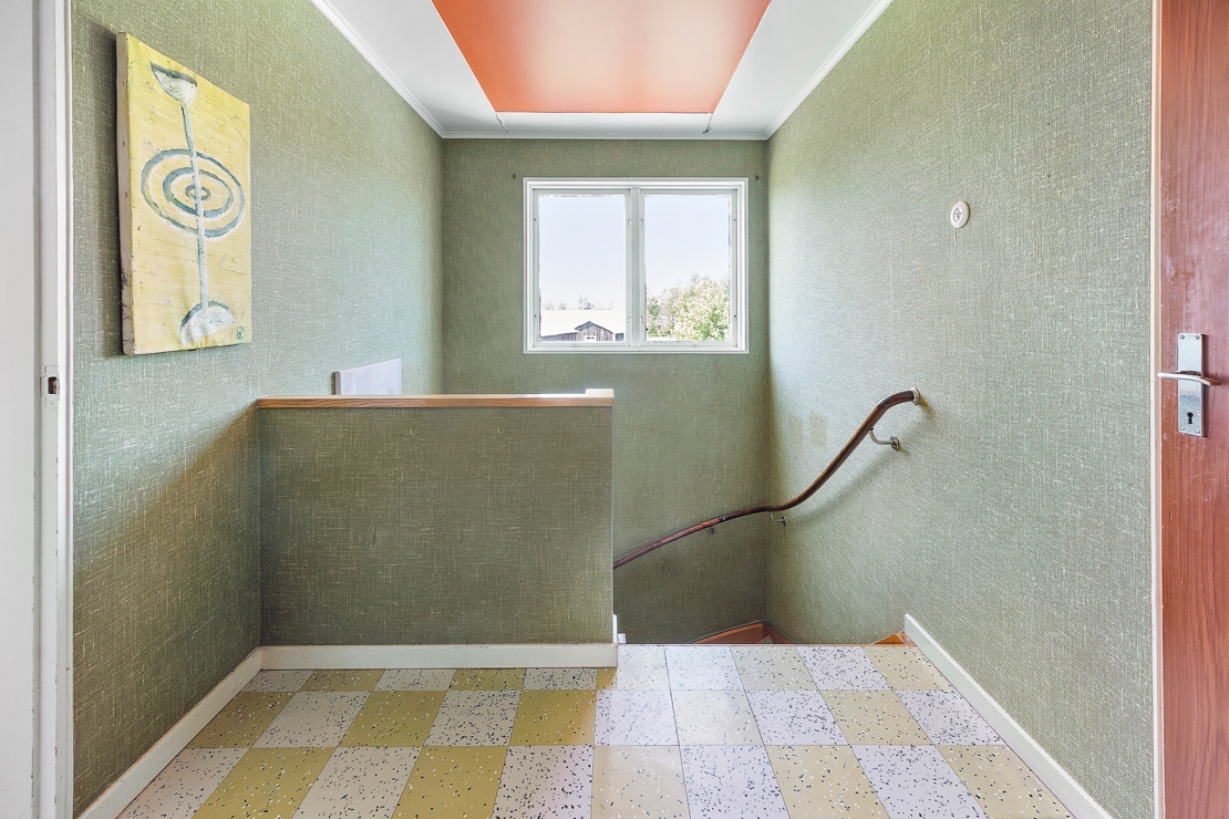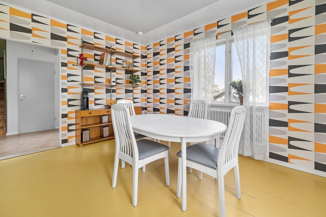 På entréplan finns det två rum, ett färgglatt kök och badrum med dusch och toalett. På övre plan finner man två sovrum med inbyggda garderober.