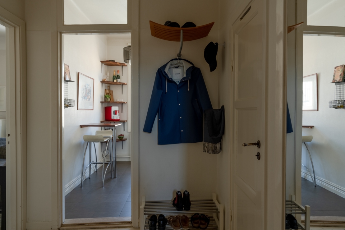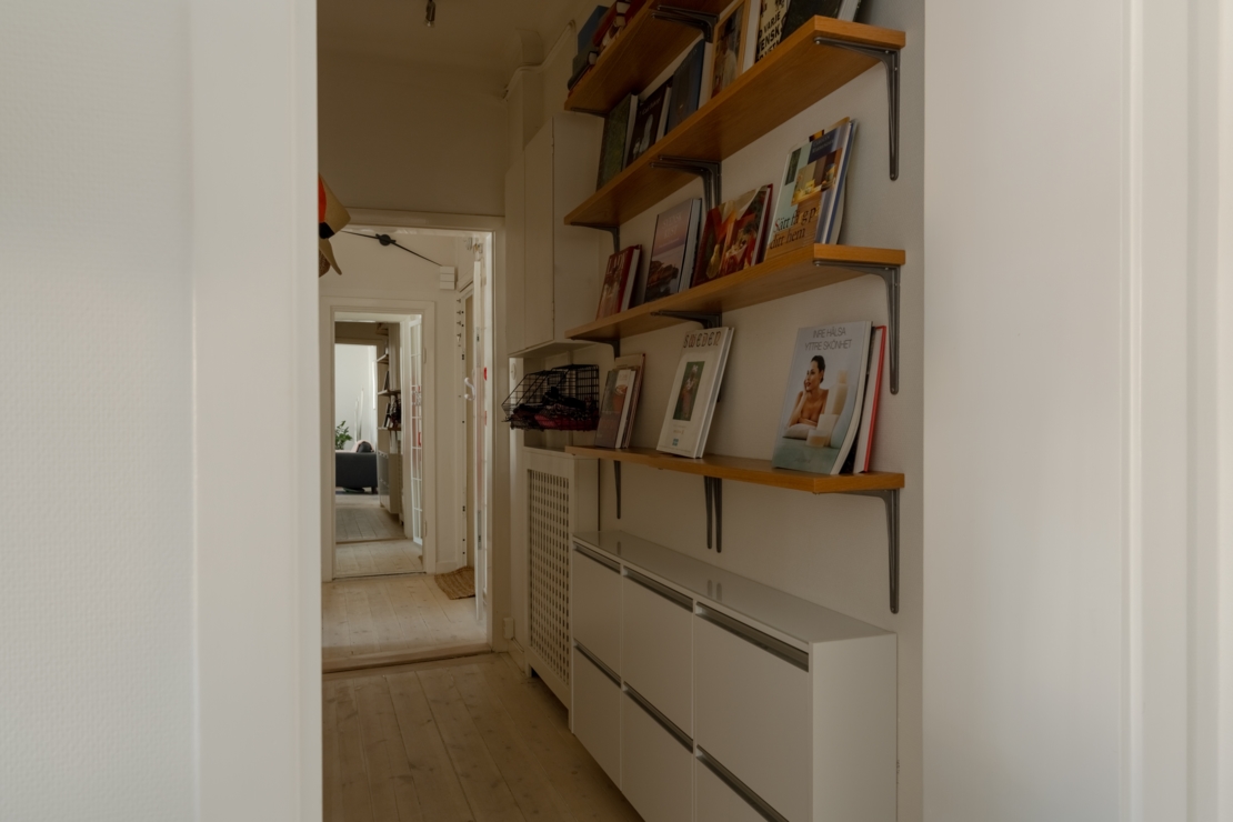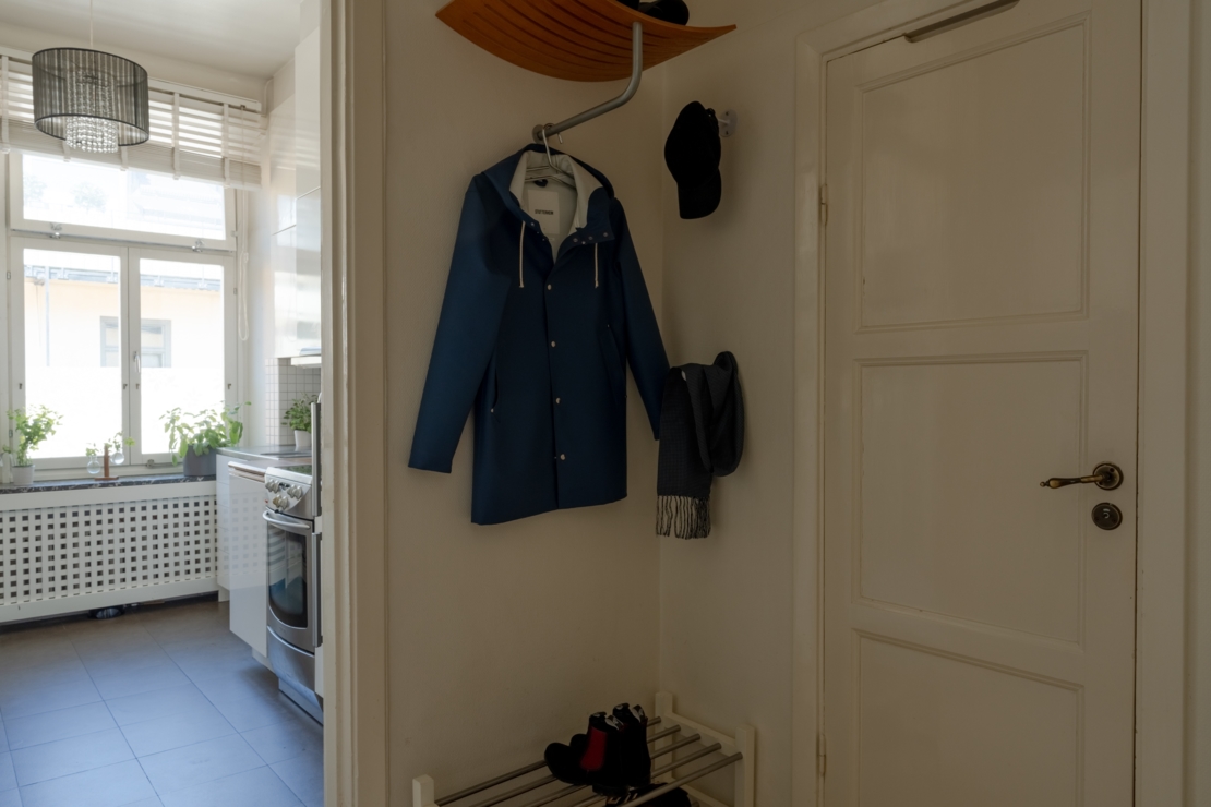 Välkomnande hall med trägolv och ljusa väggar. Plats för avhängning vid hatthylla.