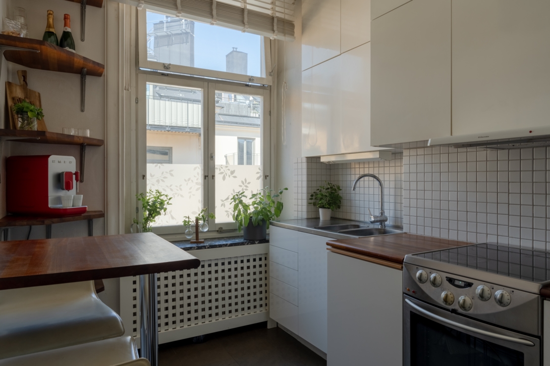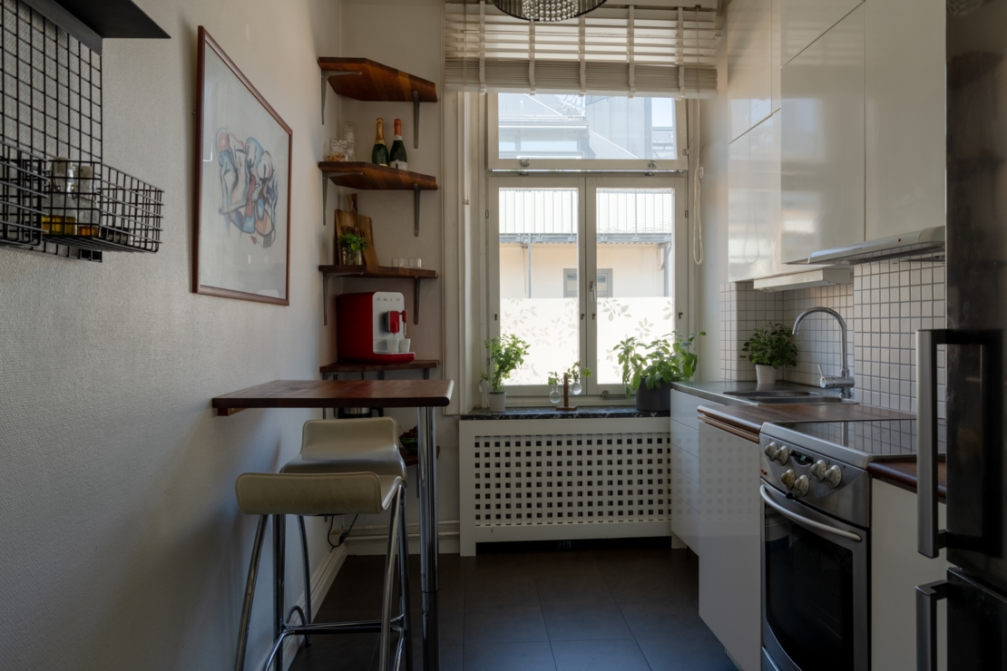 Stilrent kök med ljusa skåpluckor och kakel ovanför arbetsbänk. Köket är maskinellt utrustat med spishäll, ugn, fläkt, kyl/frys samt förberett för diskmaskin. Här finns även plats för matbord.