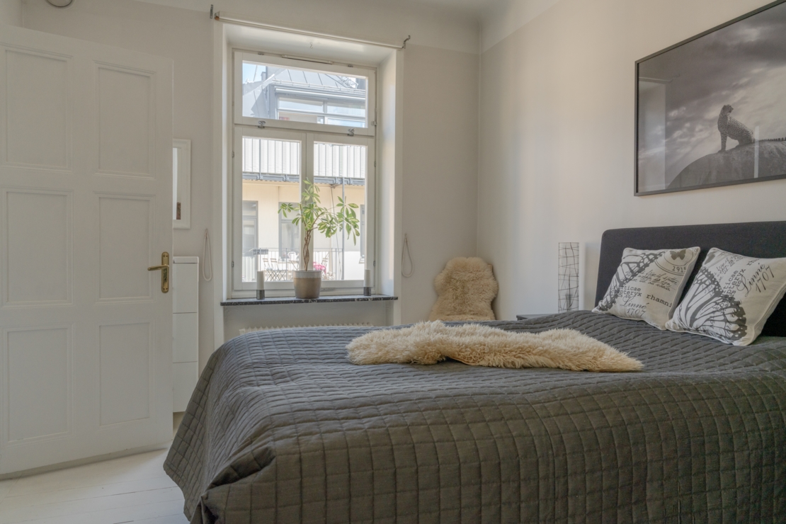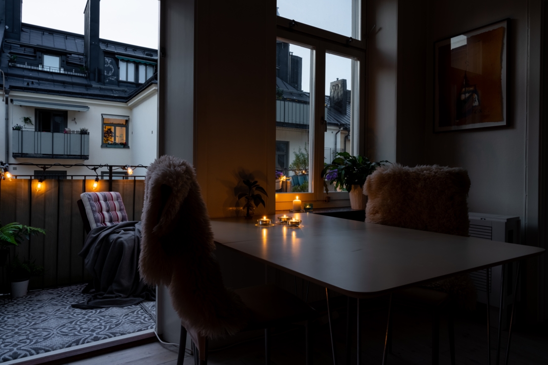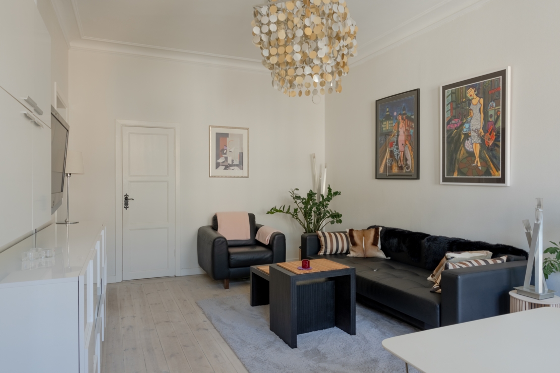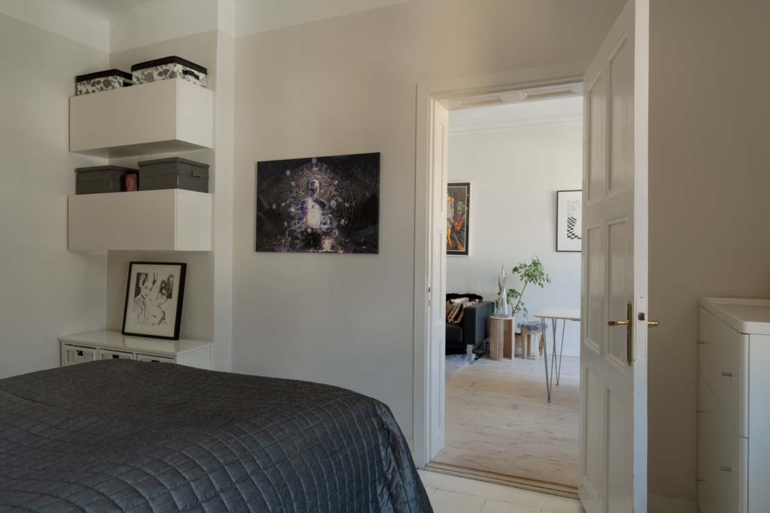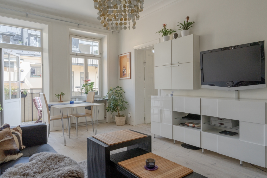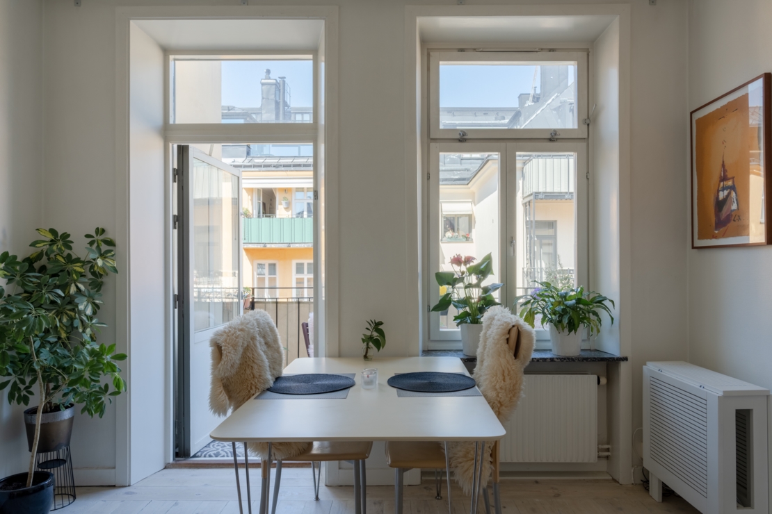 Vardagsrum med plats för soffgrupp med tillhörande möblemang, matplats, praktisk förvaring i klädkammare samt övrig möblering. Här finns utgång till lägenhetens balkong mot den härliga innergården.
