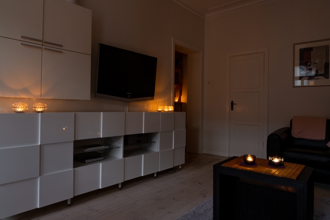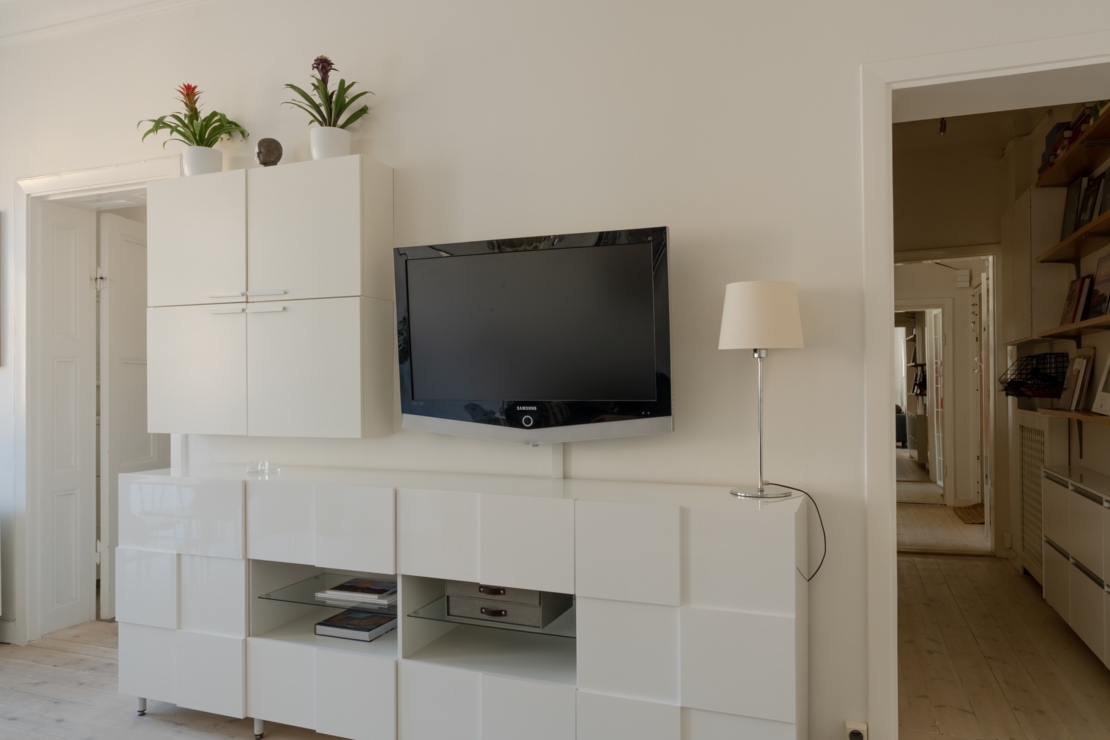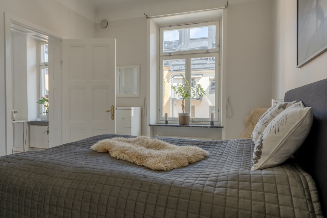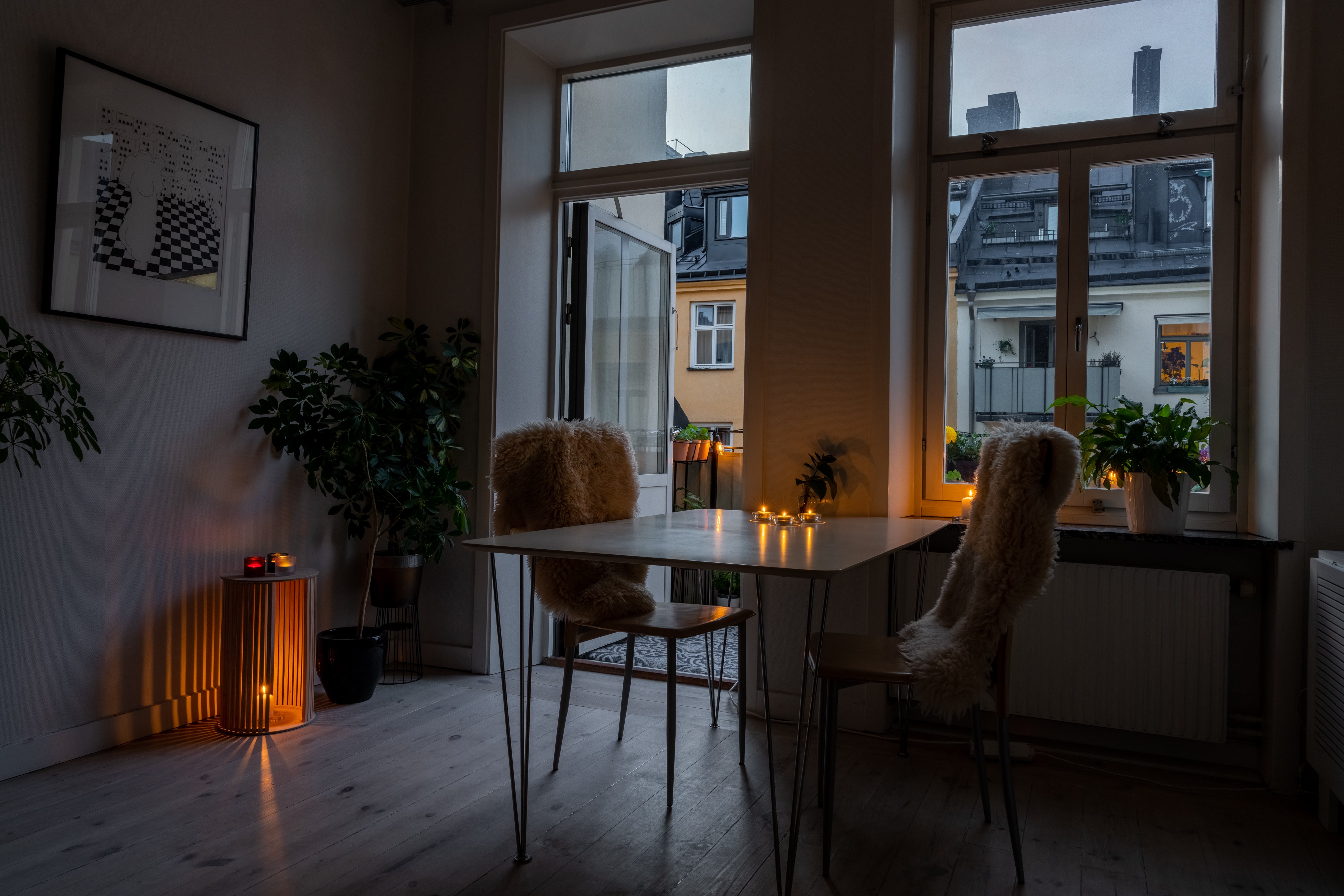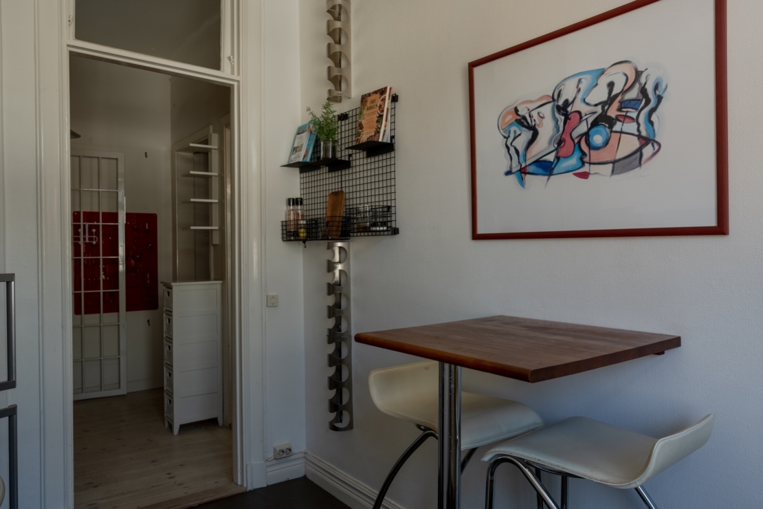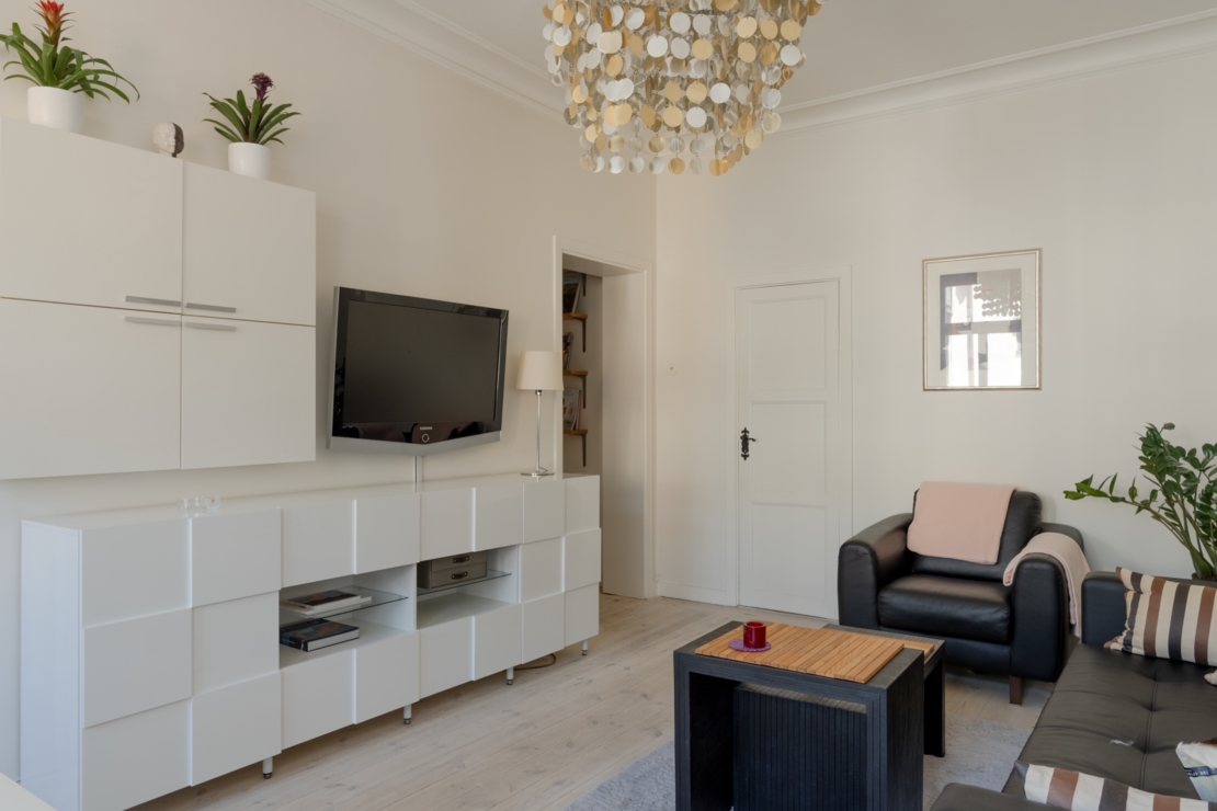 Vardagsrum med plats för soffgrupp med tillhörande möblemang, matplats, praktisk förvaring i klädkammare samt övrig möblering. Här finns utgång till lägenhetens balkong mot den härliga innergården.