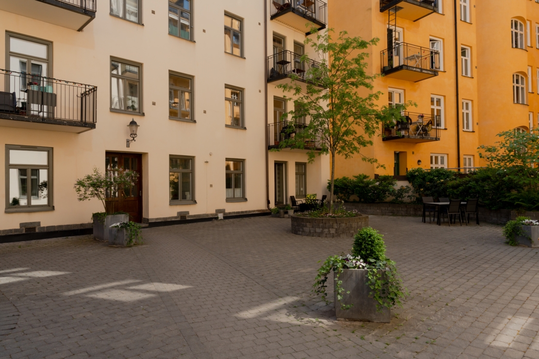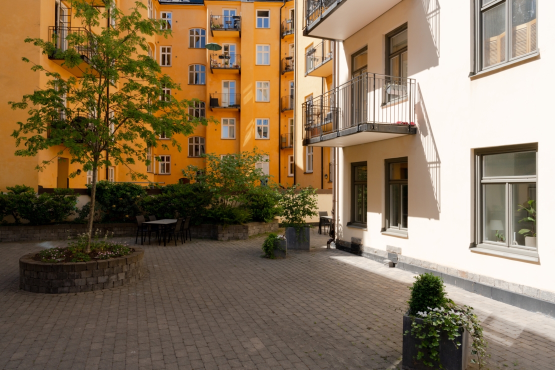 På föreningens innergård finns utemöbler, grillmöjligheter och cykelförvaring under tak.