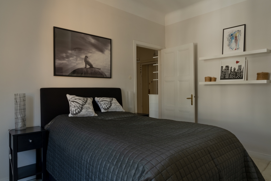 Rofyllt sovrum med trägolv och ljusa väggar. Plats för dubbelsäng, nattduksbord och förvaring om så önskas.