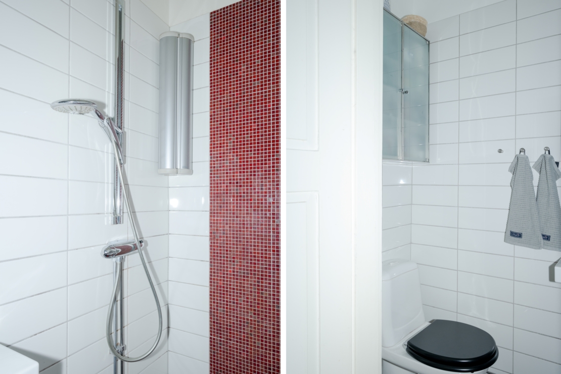 Helkaklat badrum inrett med wc, tvättställ med kommod och dusch samt förvaring i överskåp.