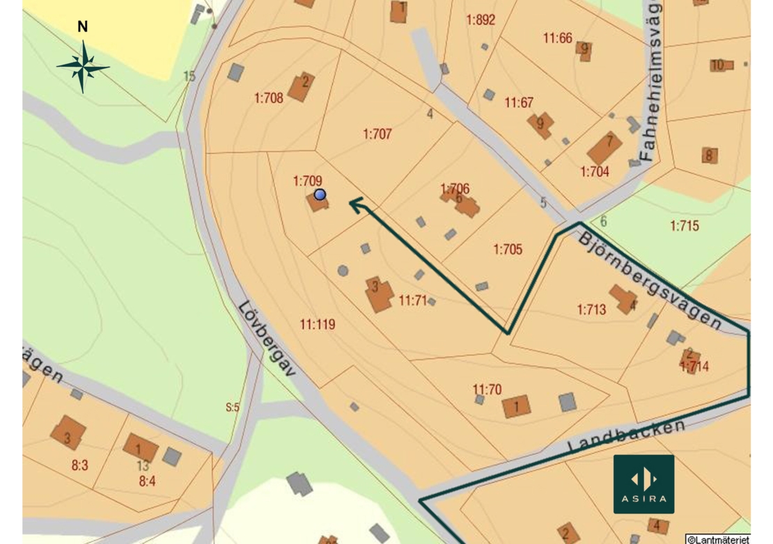 Fastigheten har adress Lövbergavägen 30, men nås från Fahnehielmsvägen. Det finns en brevlåda och parkering vid Fahnehielmsvägen 3, och det finns ett förmånsservitut inskrivet i fastighetsregistret som ger dig rätt att använda denna väg för tillfart. Det finns även en trappa i som leder ner till Lövbergavägen och erbjuder en perfekt genväg ner för berget. Trappan slutar mitt emot infarten till Proffessorstigen.