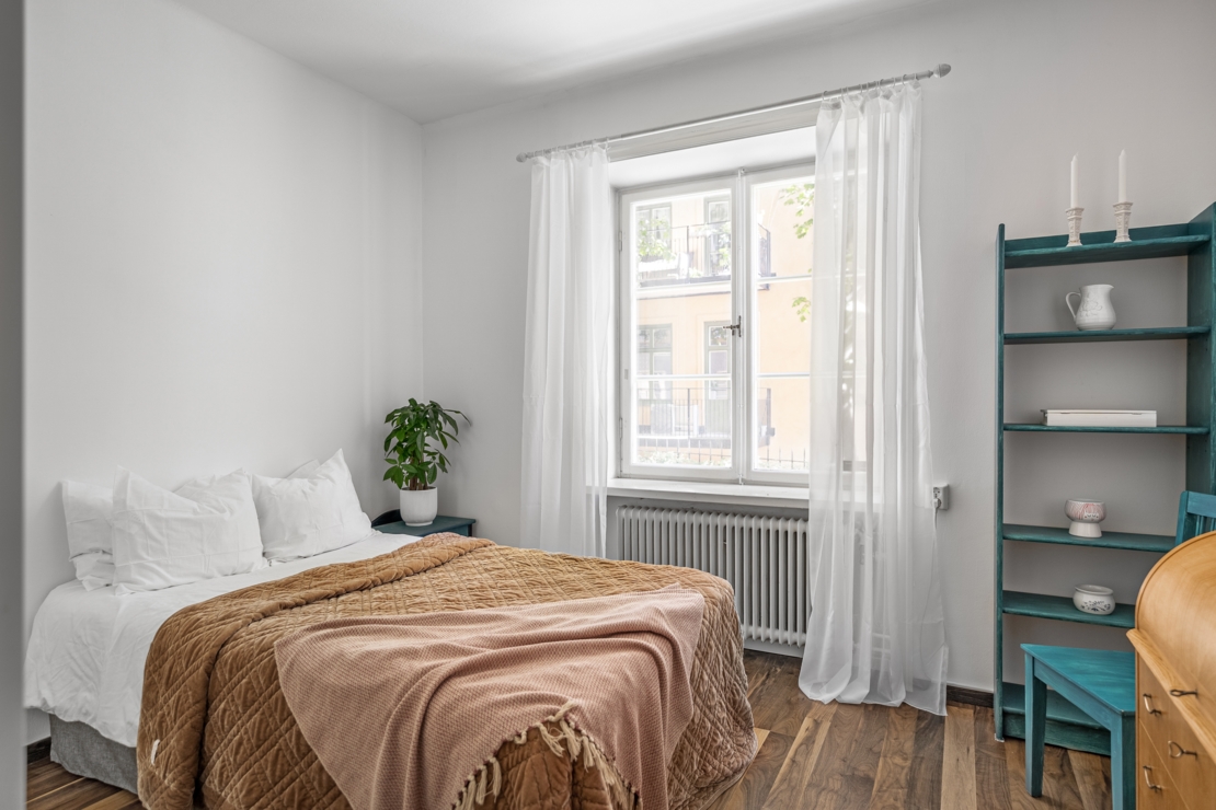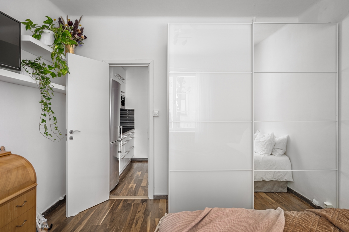 Det rymliga sovrummet erbjuder gott om utrymme för en bekväm dubbelsäng och har även en generös garderob för extra förvaring. Utanför dörren kan du koppla av och njuta av grönskan på föreningens lummiga och välskötta innergård, som även erbjuder grillmöjligheter för trevliga utomhusmiddagar.