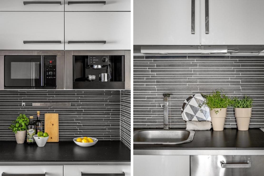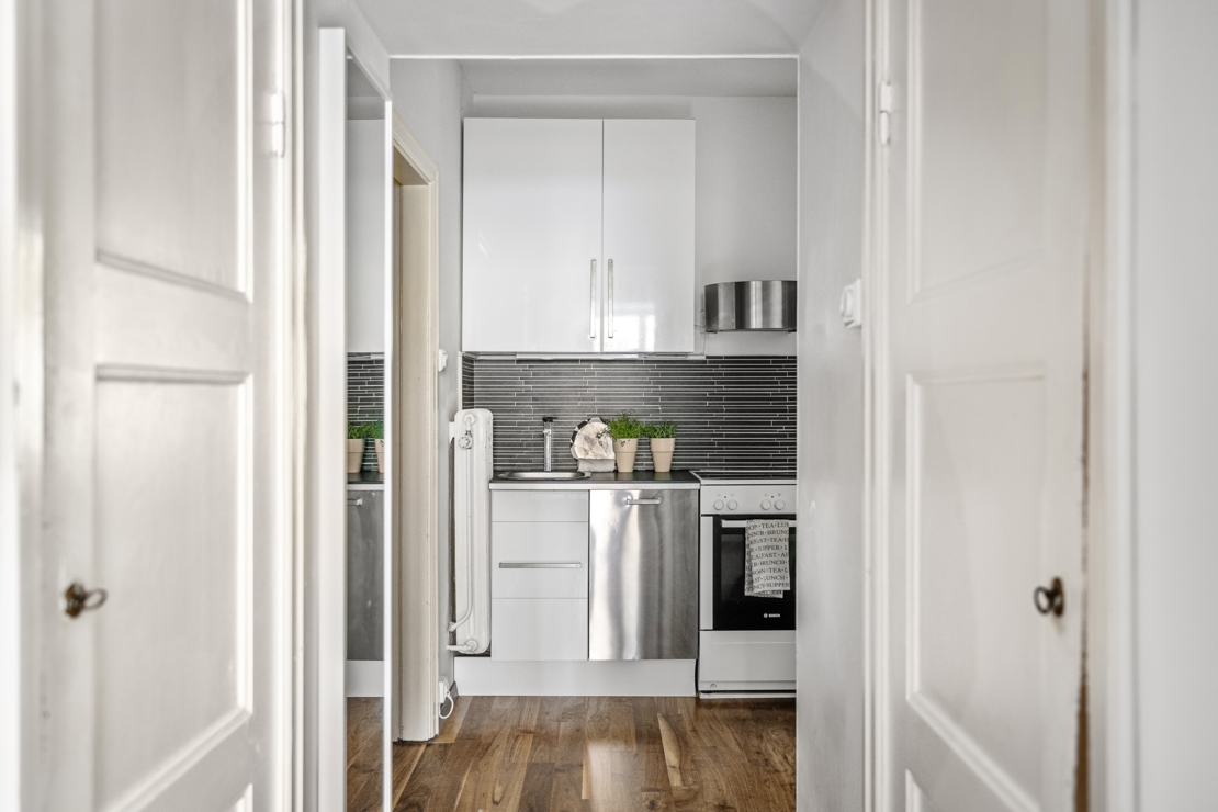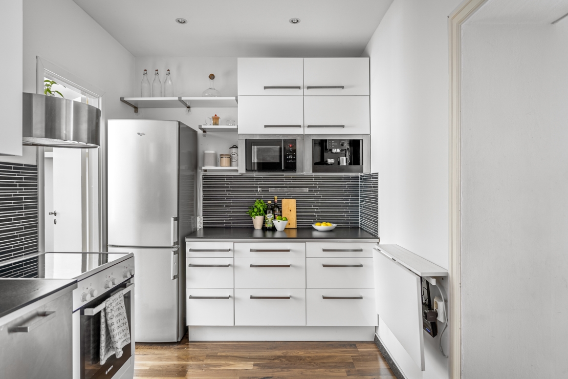 Denna bostad är en pärla med sin charmiga 20-talskaraktär, högt i tak och genomgående sober design. Köket är omsorgsfullt utformat och kombinerar avskildhet med social öppenhet, perfekt för både vardag och underhållning. I vardagsrummet finns gott om plats för en stor soffgrupp och andra möbler, samt en matplats där du kan njuta av måltider med familj och vänner.