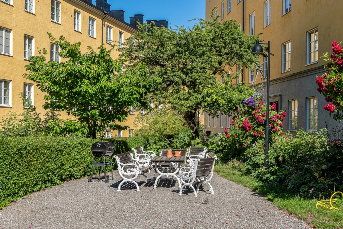 Vacker och lummig innergård med flertalet sittmöjligheter och grillar.