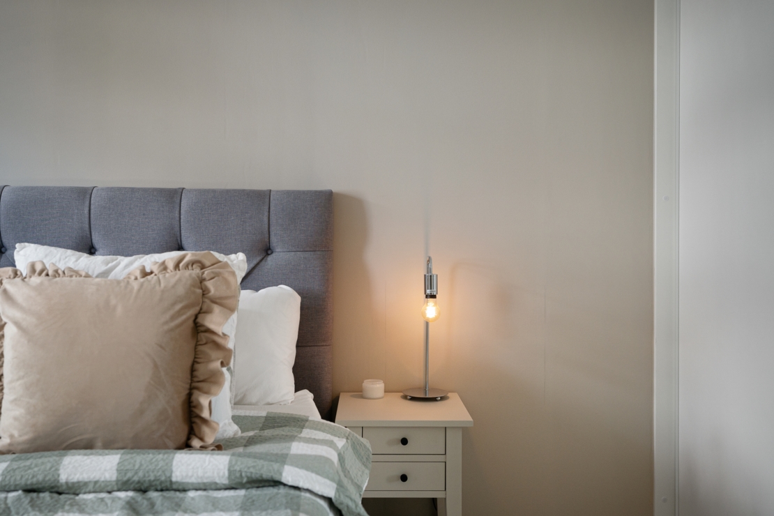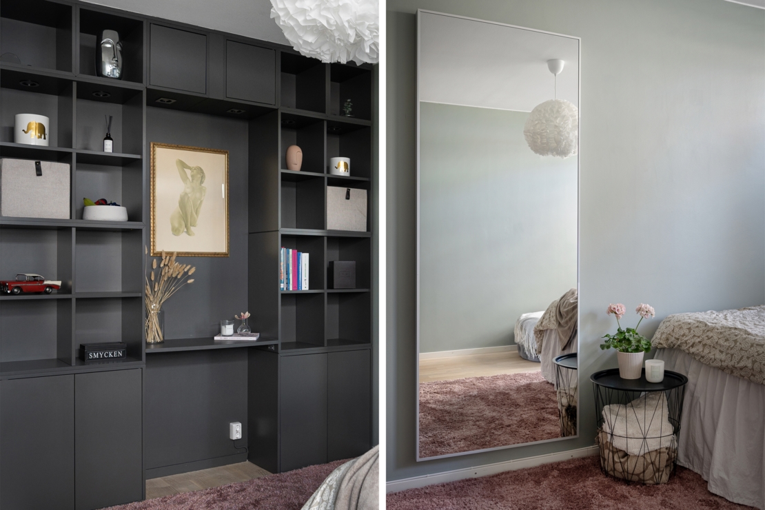 Sovrum i bra storlek med plats för dubbelsäng och arbetsplats. ekparkett och ljusgröna väggar. Vacker platsbyggd förvaring med integrerad belysning från Philips Hue.
