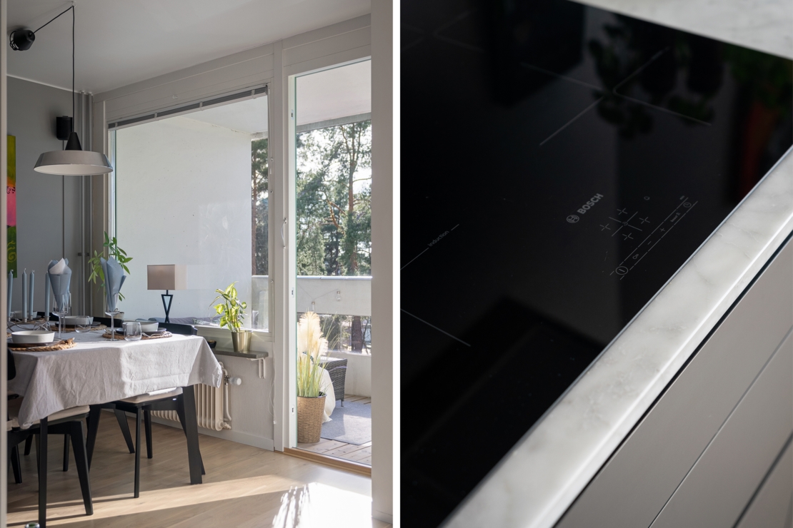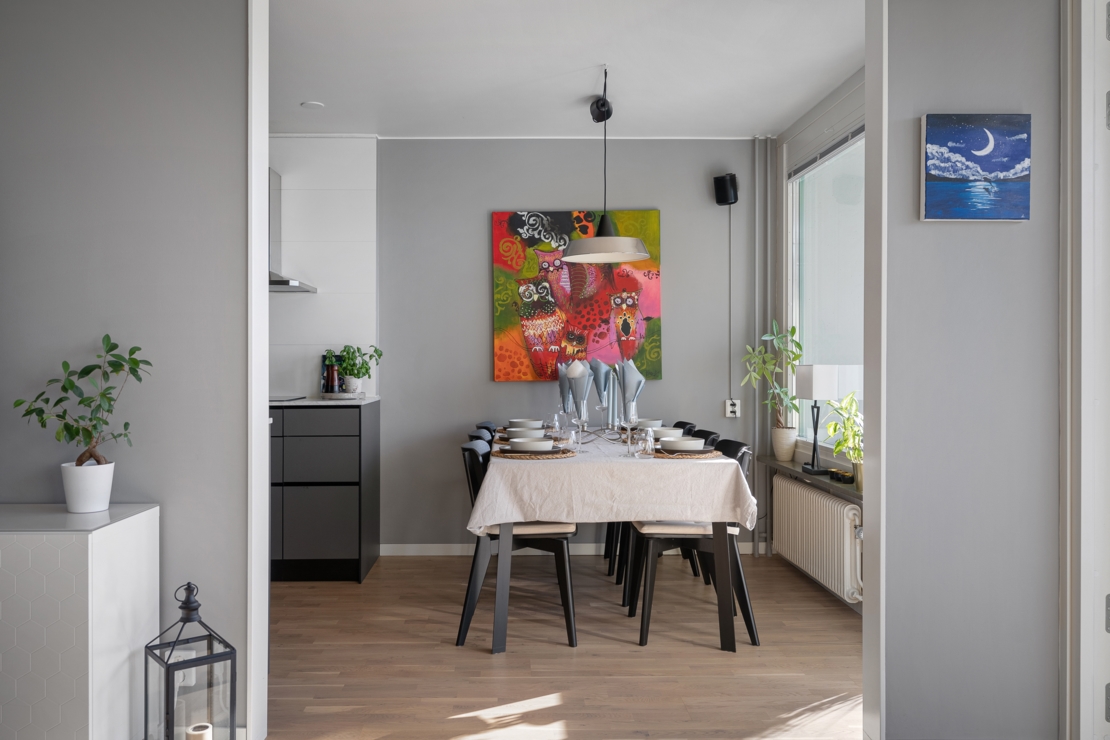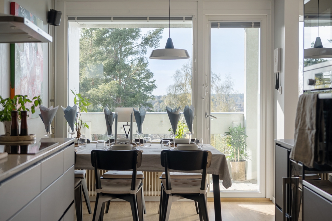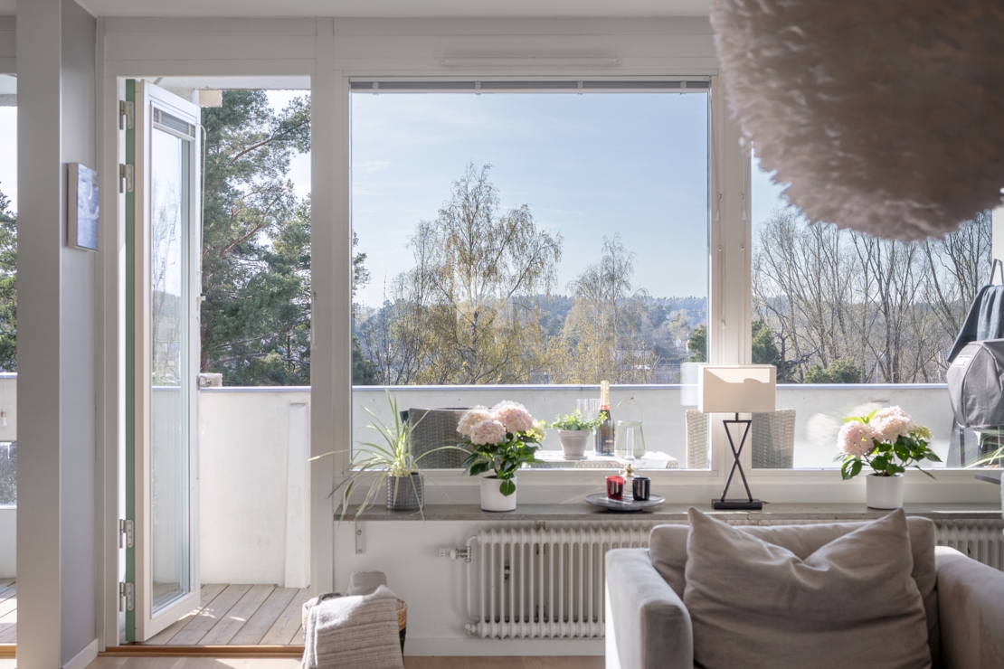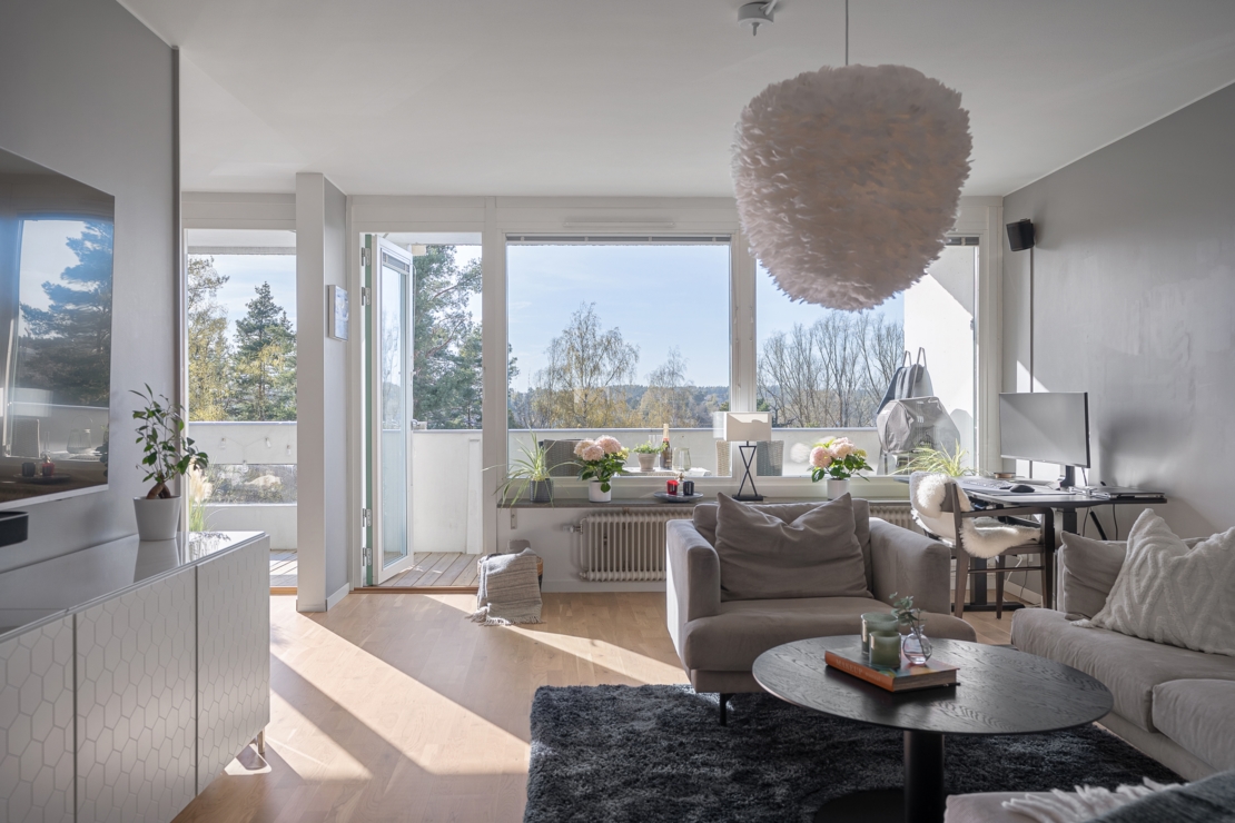 Stort vardagsrum med social planlösning och öppet mot kök, samt ekparkett och ljusa väggar. Här finns det plats för såväl soffgrupp som matbord. Stora fönster och utgången till den inglasade balkongen ger ett härligt ljusinsläpp.