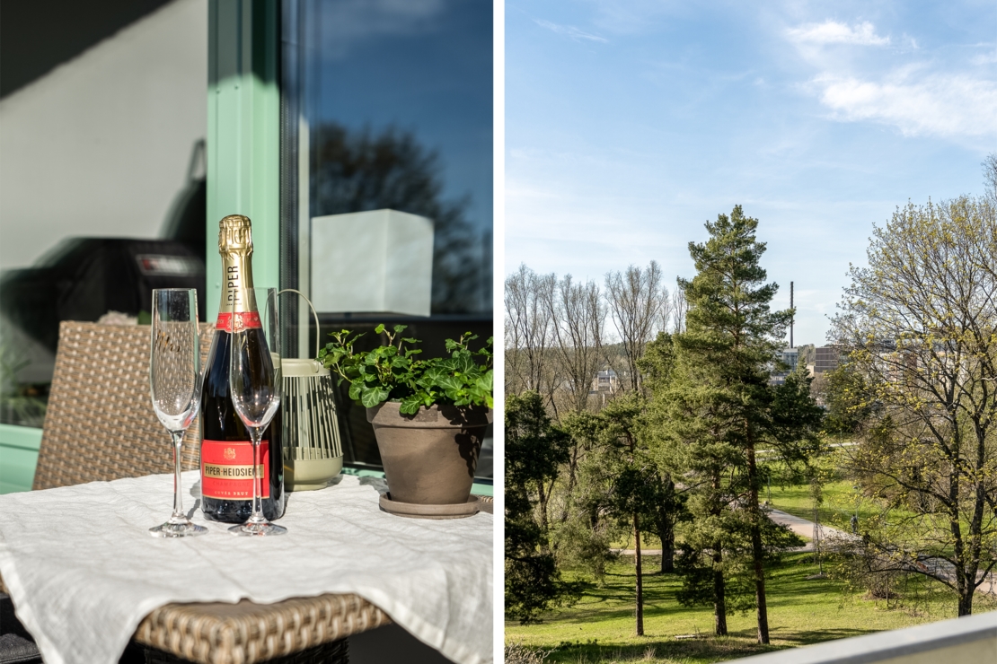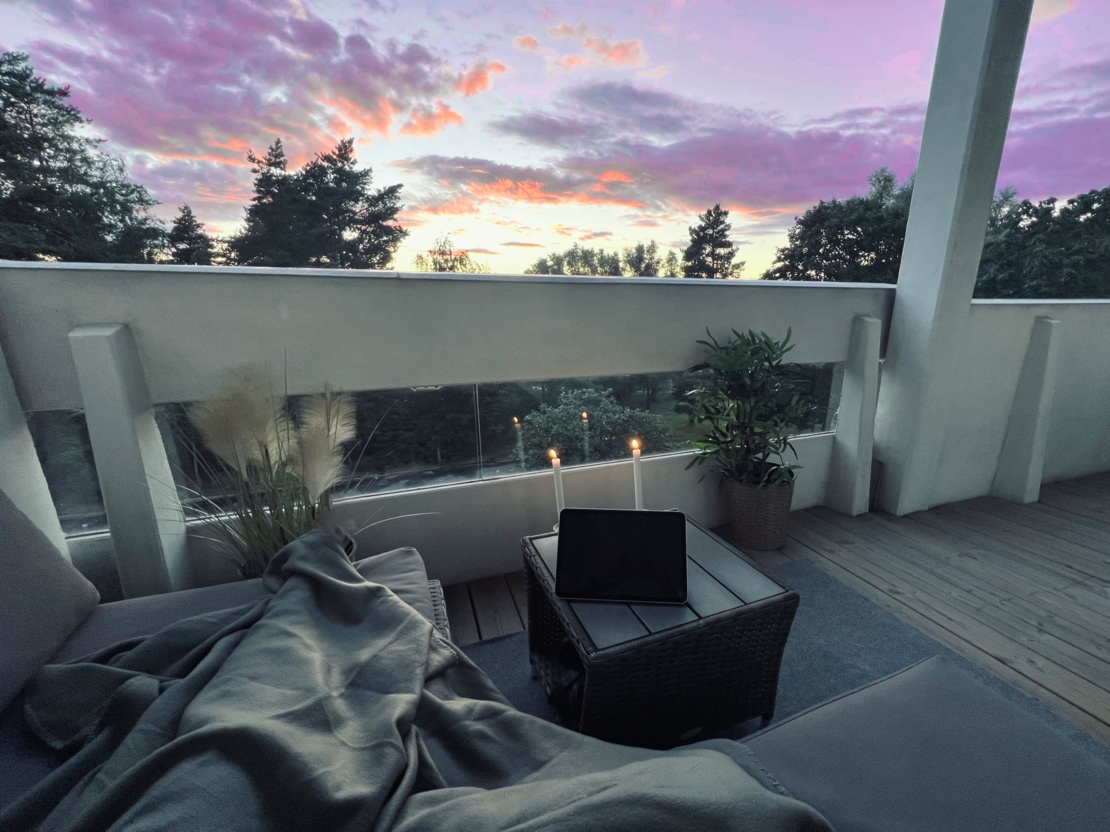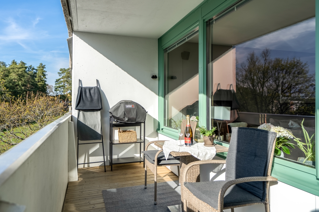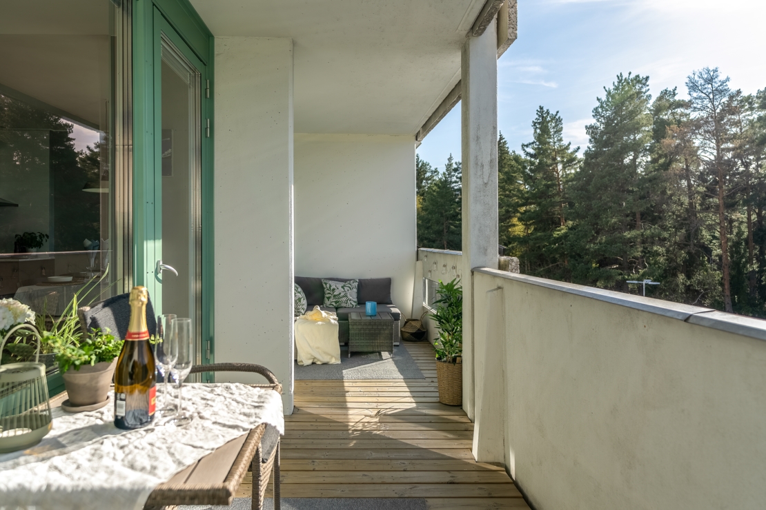 Mysig och ombonad dubbel-balkong i perfekt västläge med härlig utsikt bort mot Täby centrum. Balkong kan enkelt möbleras med lounge möbler och ett större bord för 4-6 sällskap. Grillmöjligheter och fantastisk utsikt! (möjlig att glasa in).