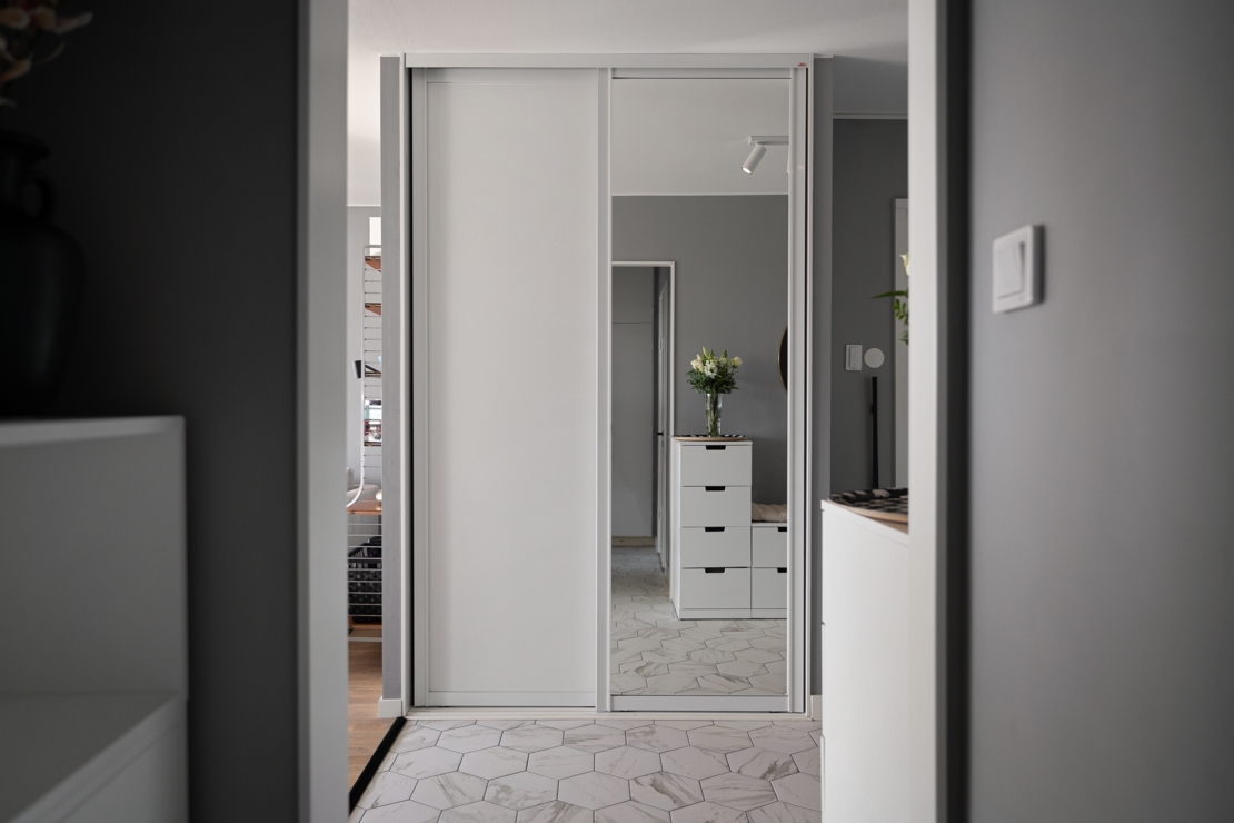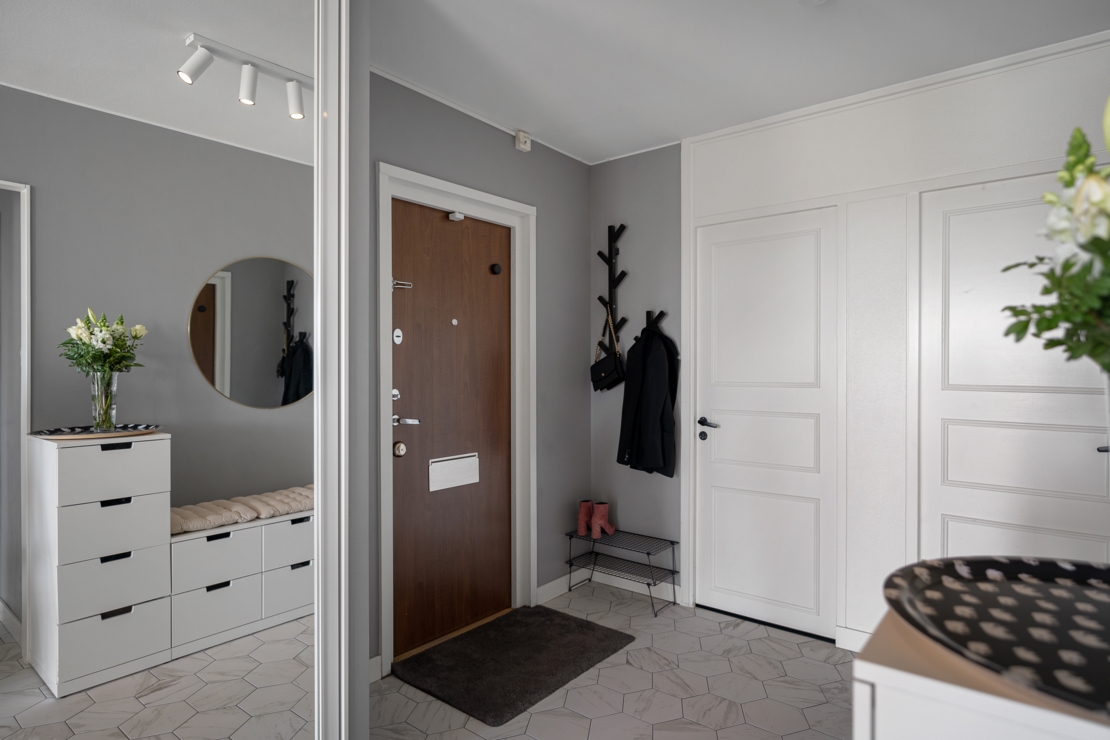Välkomnande hall med stora klinkerplattor på golv och gråa väggar. Här finns det avhängningsmöjligheter och gott om plats för förvaring i platsbyggd Elfa-garderob.