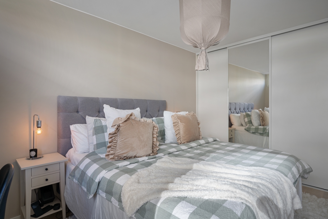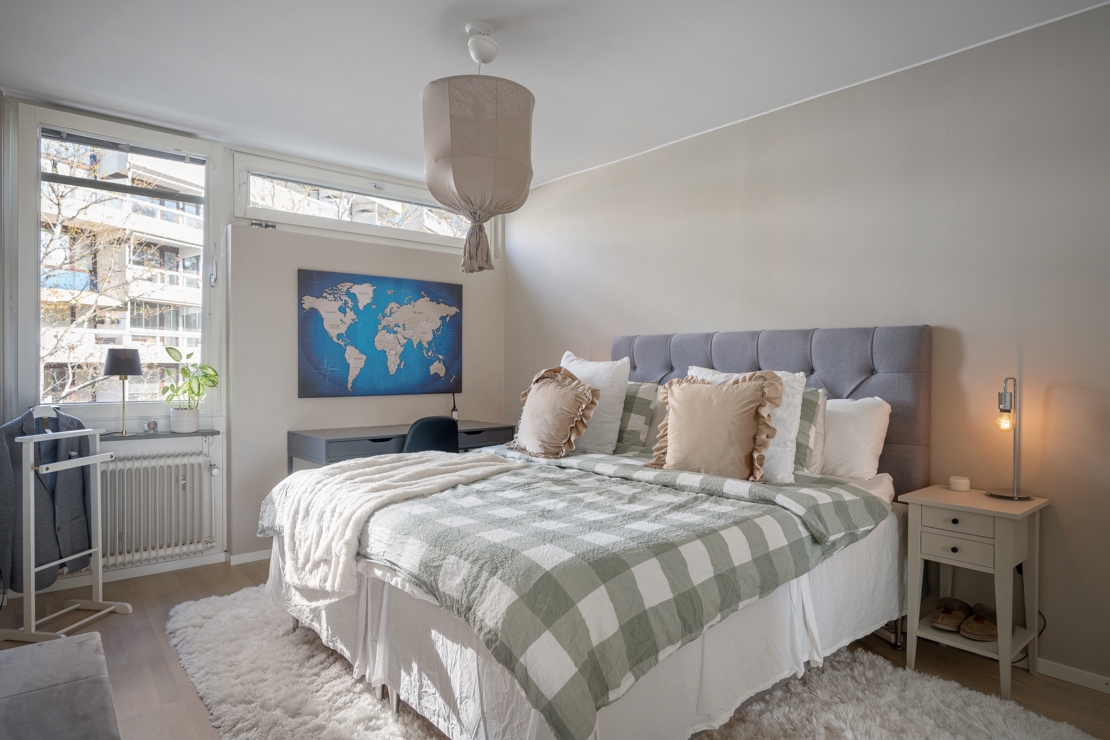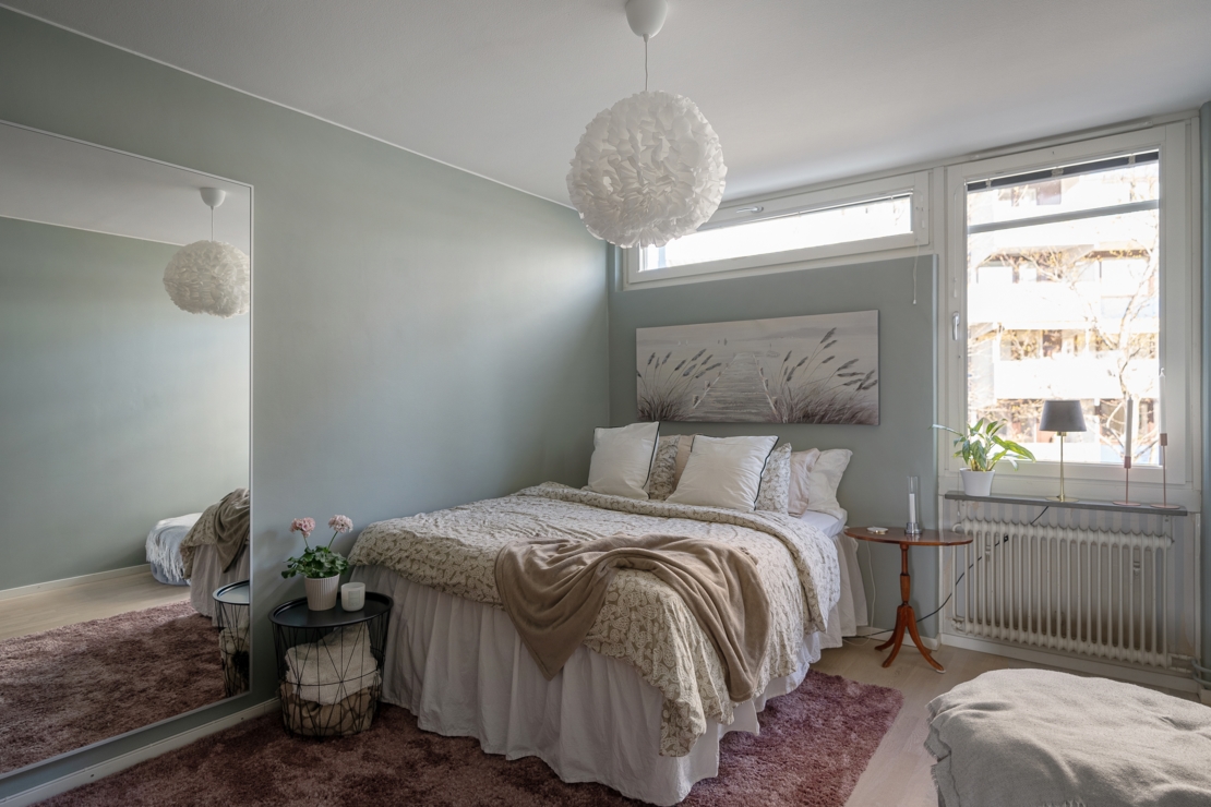 Sovrum med plats för dubbelsäng i lugnt läge mot gården. Sovrummet har två fönster, ett större och ett smalt längs taket. Här finns det bra klädesförvaring i garderob. Ekparkett och beiga väggar.