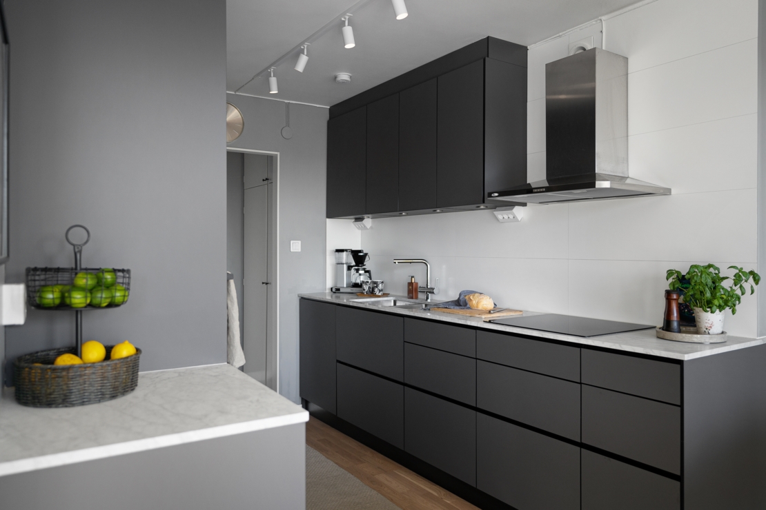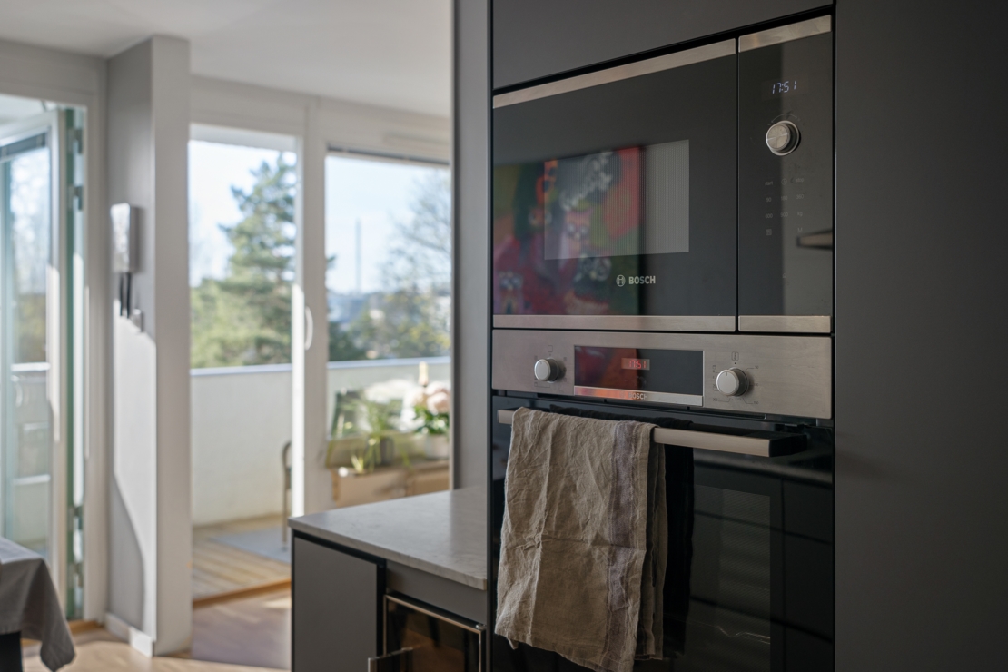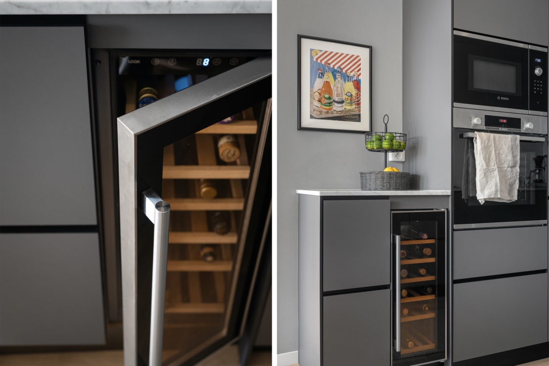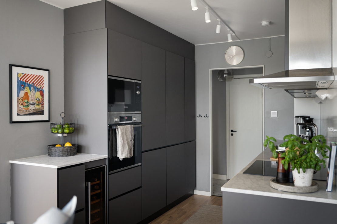 Lyxigt Kvikkök fullutrustat med kvalitativa vitvaror från Bosch och bl.a. dubbel Kyl och frys, samt vinkyl. Stenskiva på bänk samt släta gråa luckor som ger en stilren look.