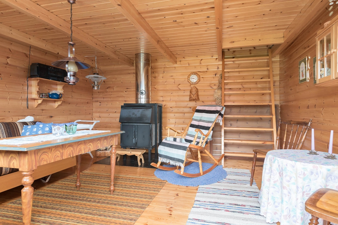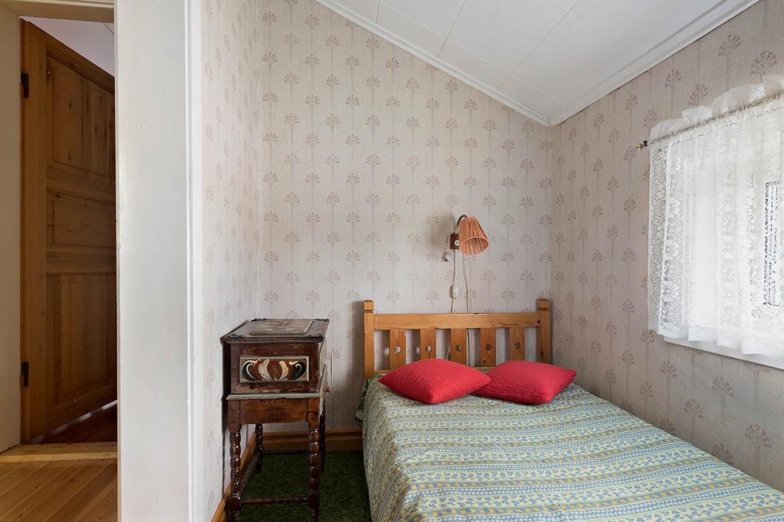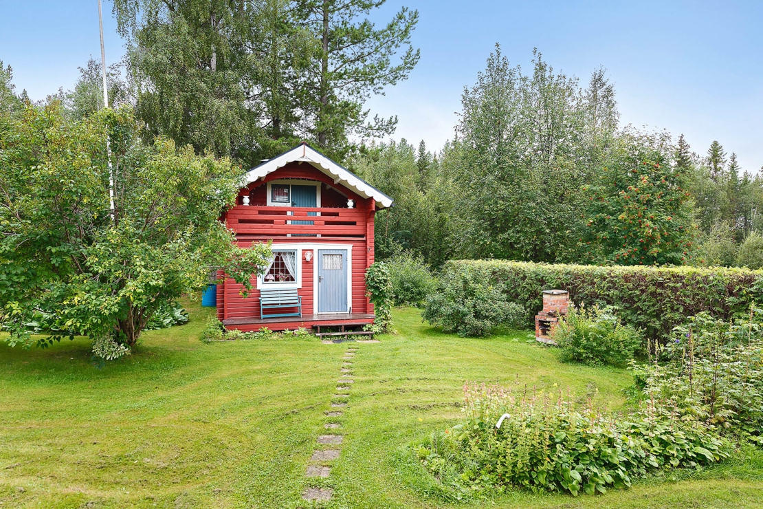 Den nästan 2000 kvm stora och soliga tomten rymmer en välskött timrad härbre/gäststuga med ett allrum som har en öppen spis, samt ett sovrum på övervåningen med balkong.