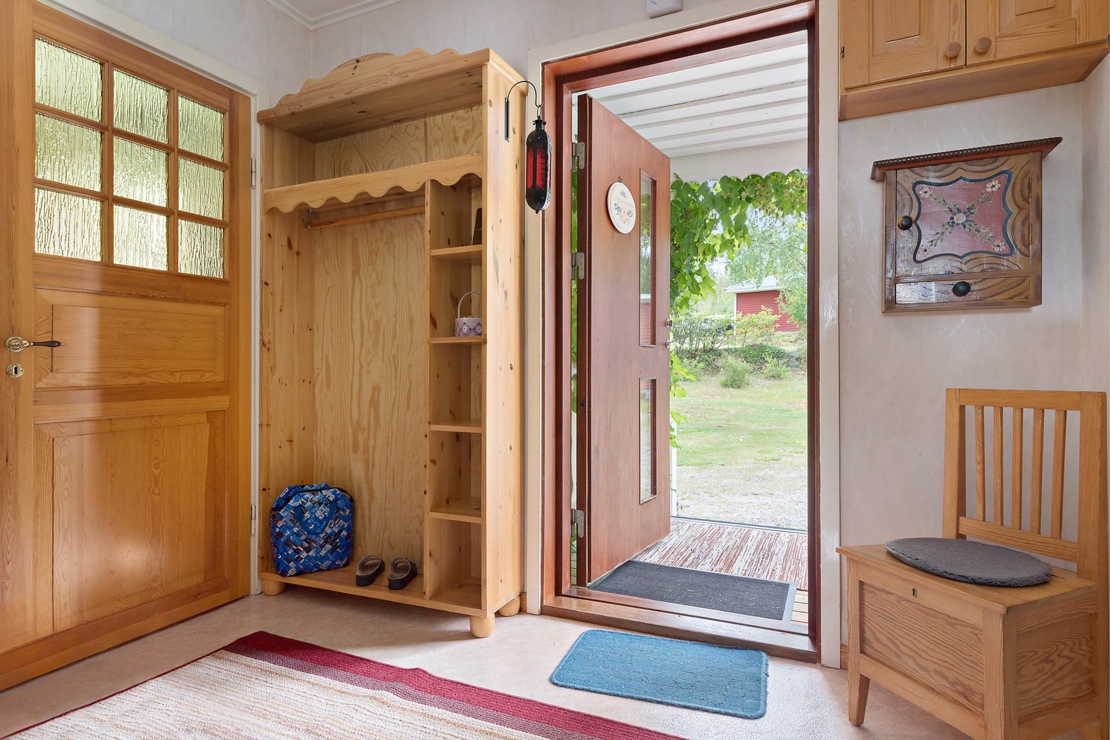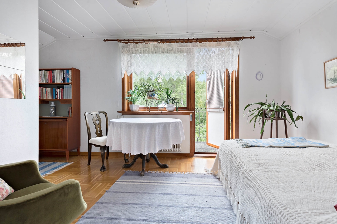 På entréplan hittar du ett rymligt kök, ett badrum med dusch och toalett, ett vardagsrum och ett sovrum. Övervåningen inrymmer ett sovrum med balkong och inbyggda garderober, samt ett rum med sovalkov, en hall och två stora garderober/förråd.