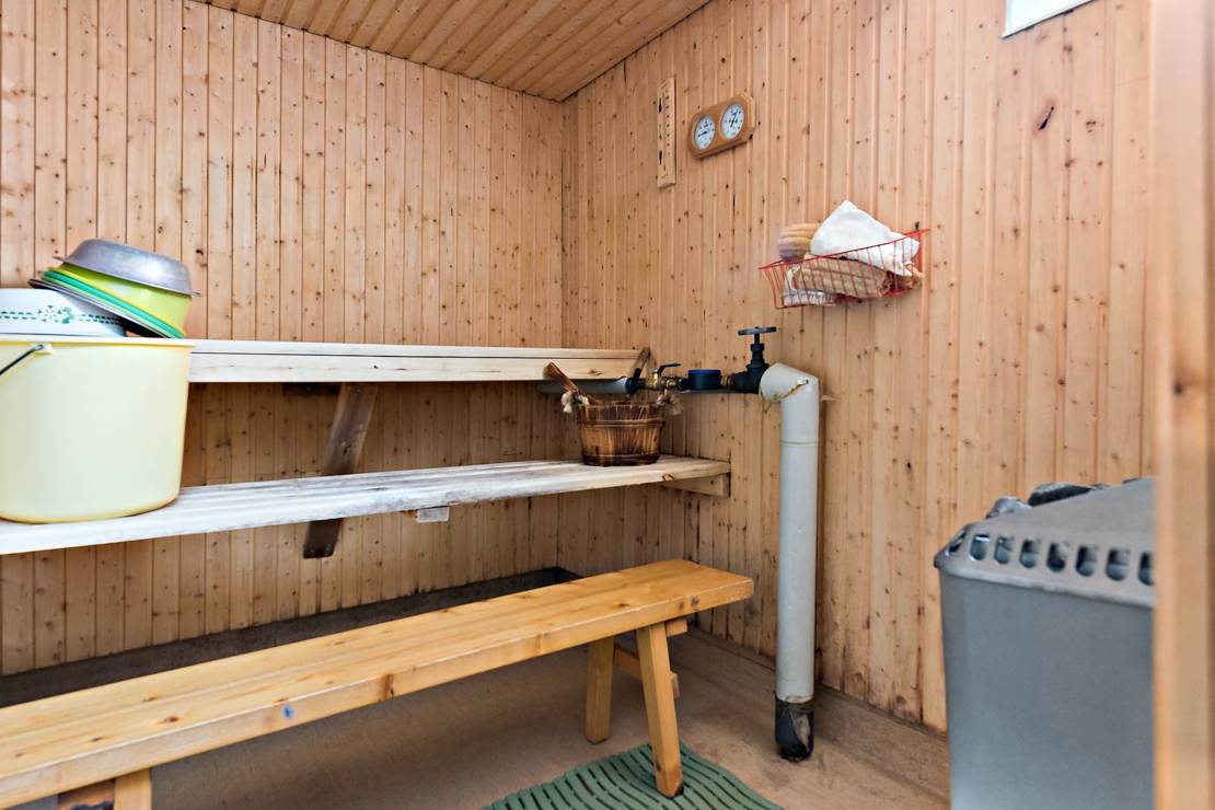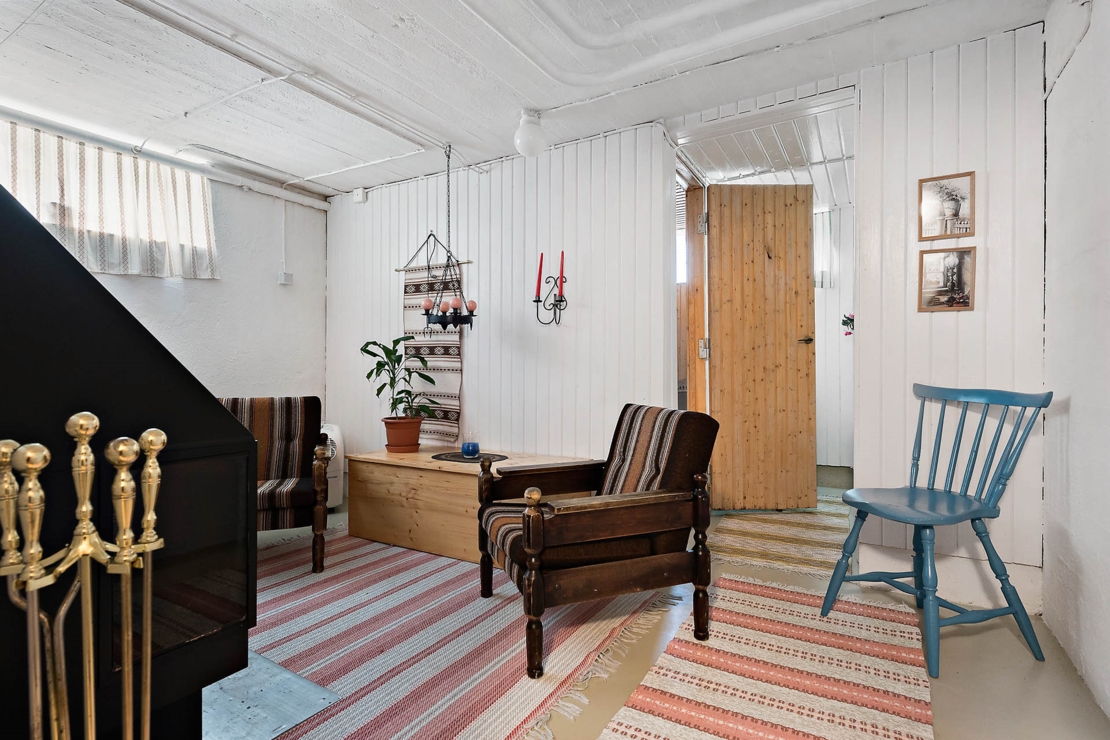I källaren finns en bastu med dusch, en relaxavdelning med öppen spis, ett verkstad/hobbyrum, en tvättstuga och en matkällare. Här finns även en mindre hall med vedspis.