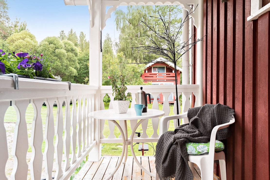 På husets framsida kan du njuta av en trevlig altan under tak med utsikt över trädgården.