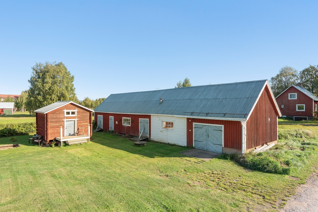 På den stora tomten finns ett timrat härbre med allrum och loft, samt en ladugårdslänga som innehåller ett isolerat garage, skotergarage, förråd och vedbod. Trädgården är välskött med både jordgubbsland och vinbärsbuskar. Det finns även en eldplats med utsikt över älven.
