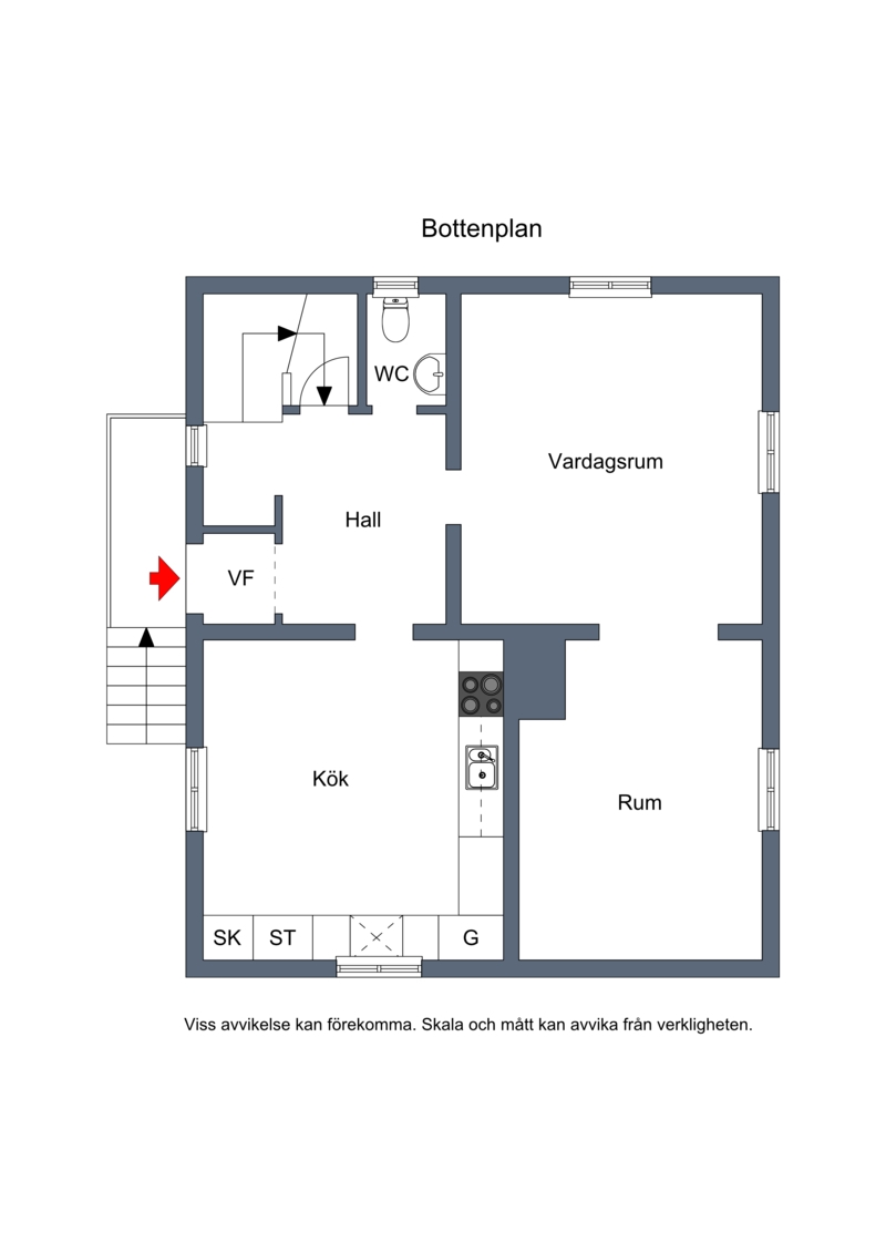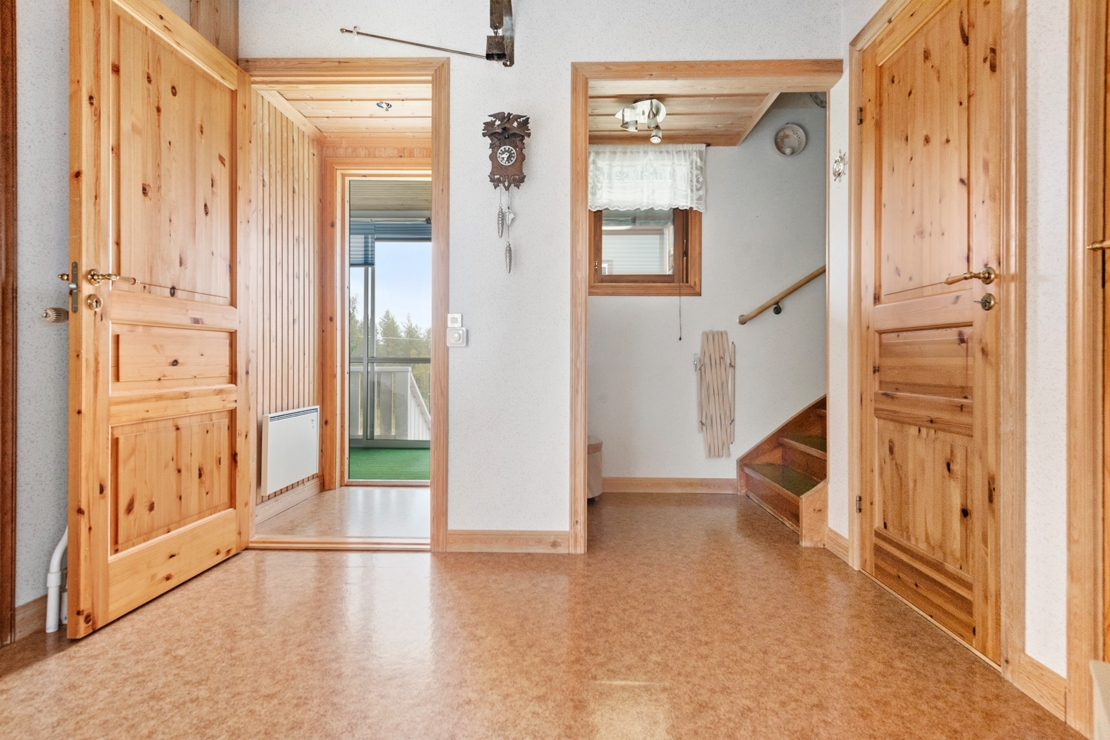 På entréplan finner man ett välutrustat kök med trevlig utsikt över trädgården, ett stort vardagsrum med fint parkettgolv, sovrum med inbyggda garderober och toalett.