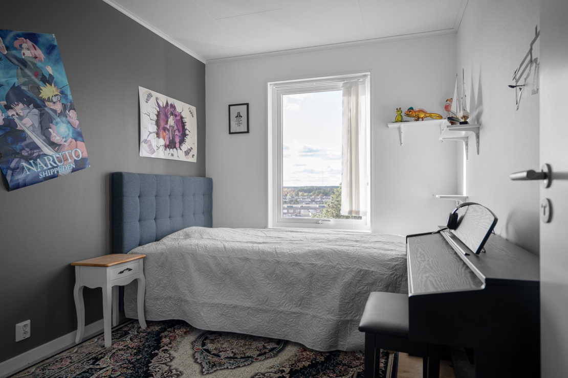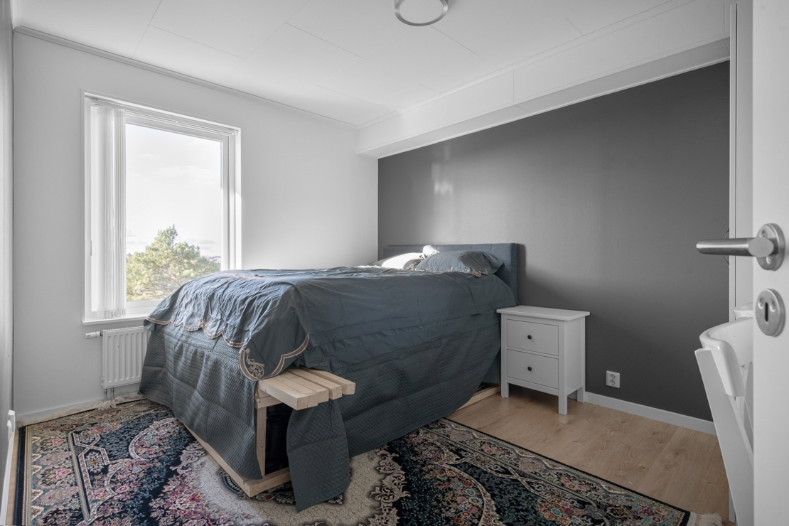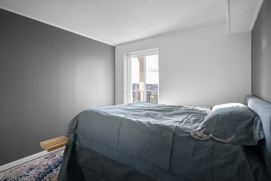 Det stora sovrummet åtnjuter fönster mot sydväst, parkettgolv, vita och grå väggar, samt inbyggd förvaring. Här finns plats för dubbelsäng, samt skrivbord och nattduksbord.