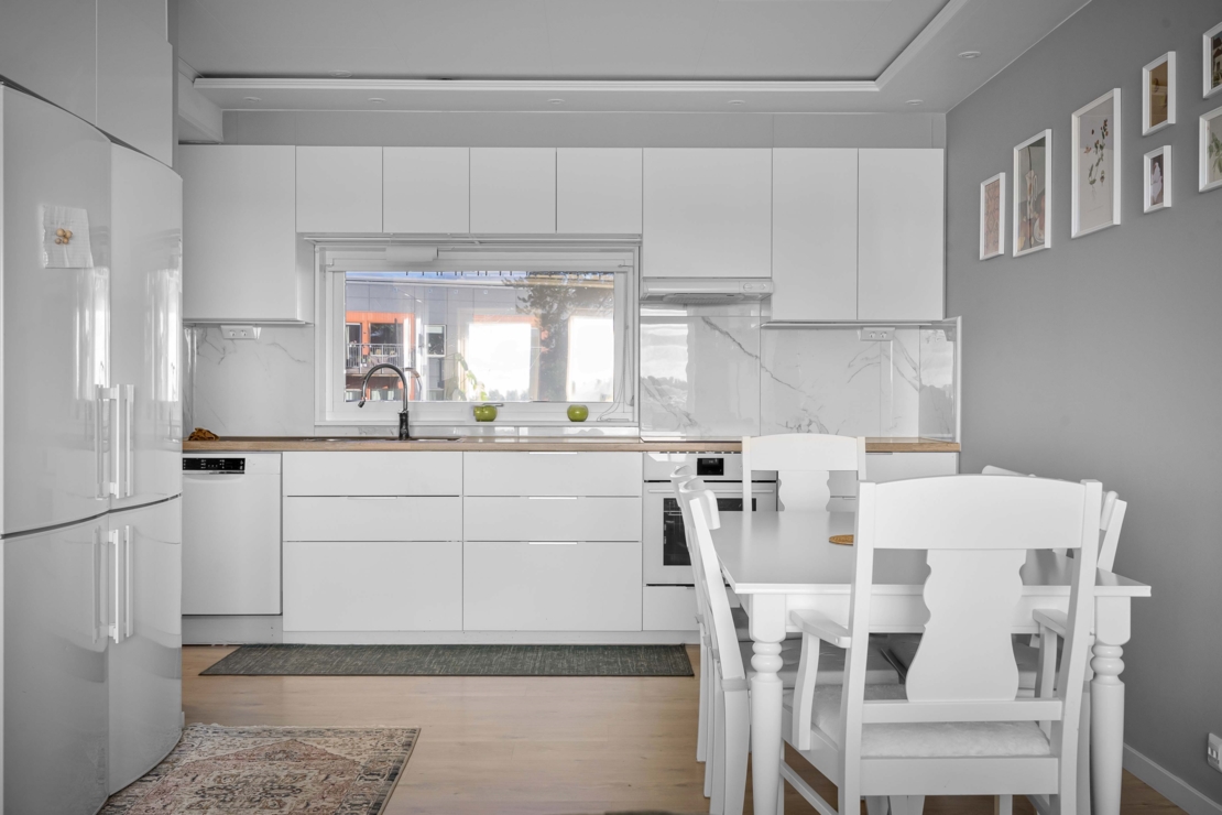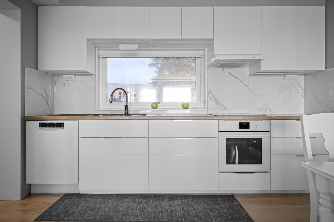 Modernt kök med stilrena materialval, vita luckor och marmorklinkers på vägg, samt kvalitativa vitvaror från Bosch bestående av häll/ugn, dubbla kyl/frys, diskmaskin, samt köksfläkt. Intill finns plats för en större matgrupp om 4–6 personer.