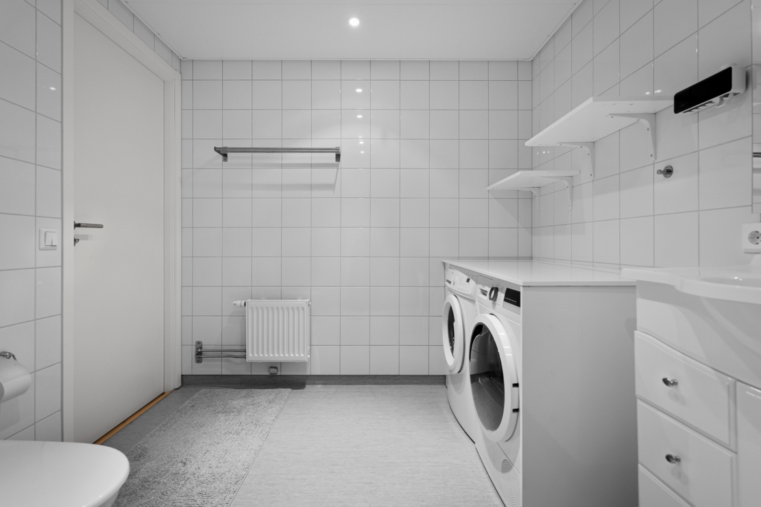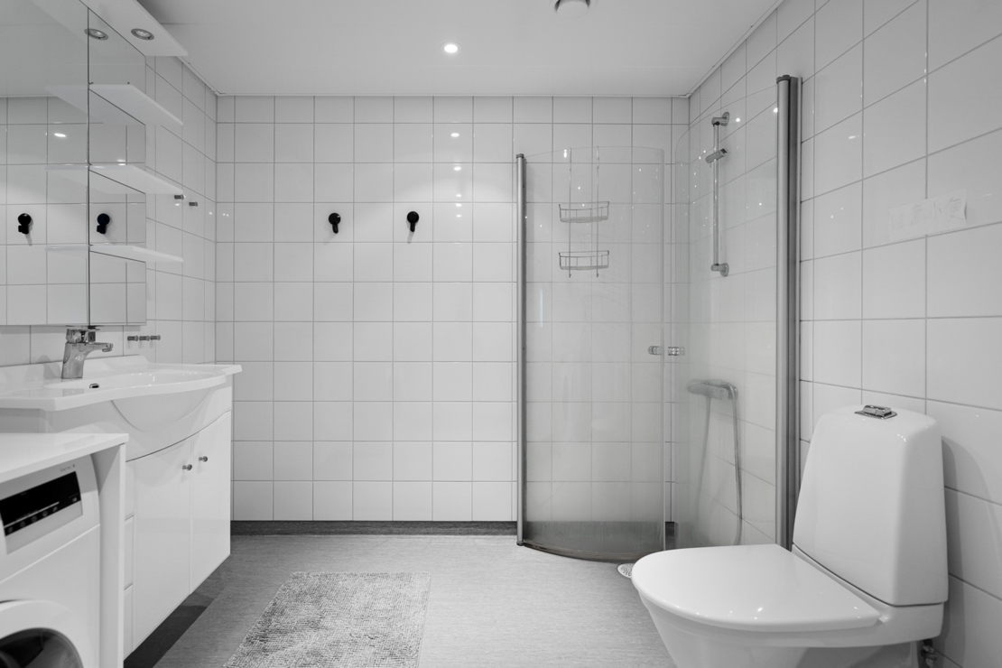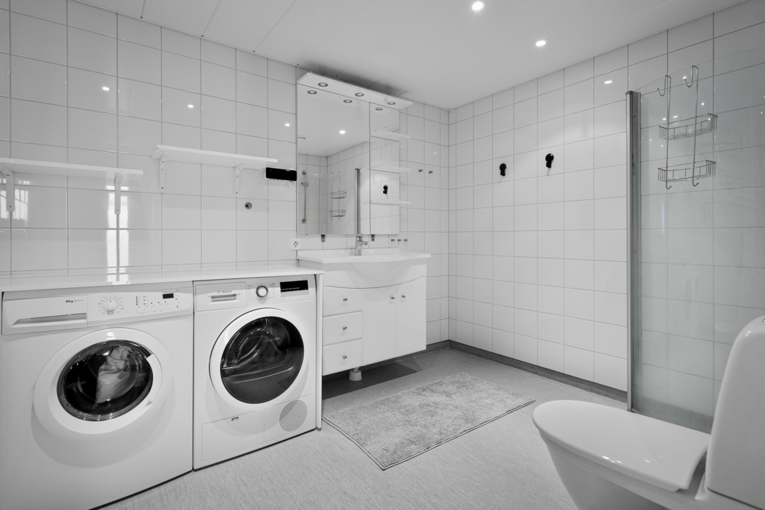 Stort badrum med tvättmaskin och torktumlare, WC, handfat med kommod och spegelskåp, samt duschhörna. Grått golv och vitkaklade väggar.