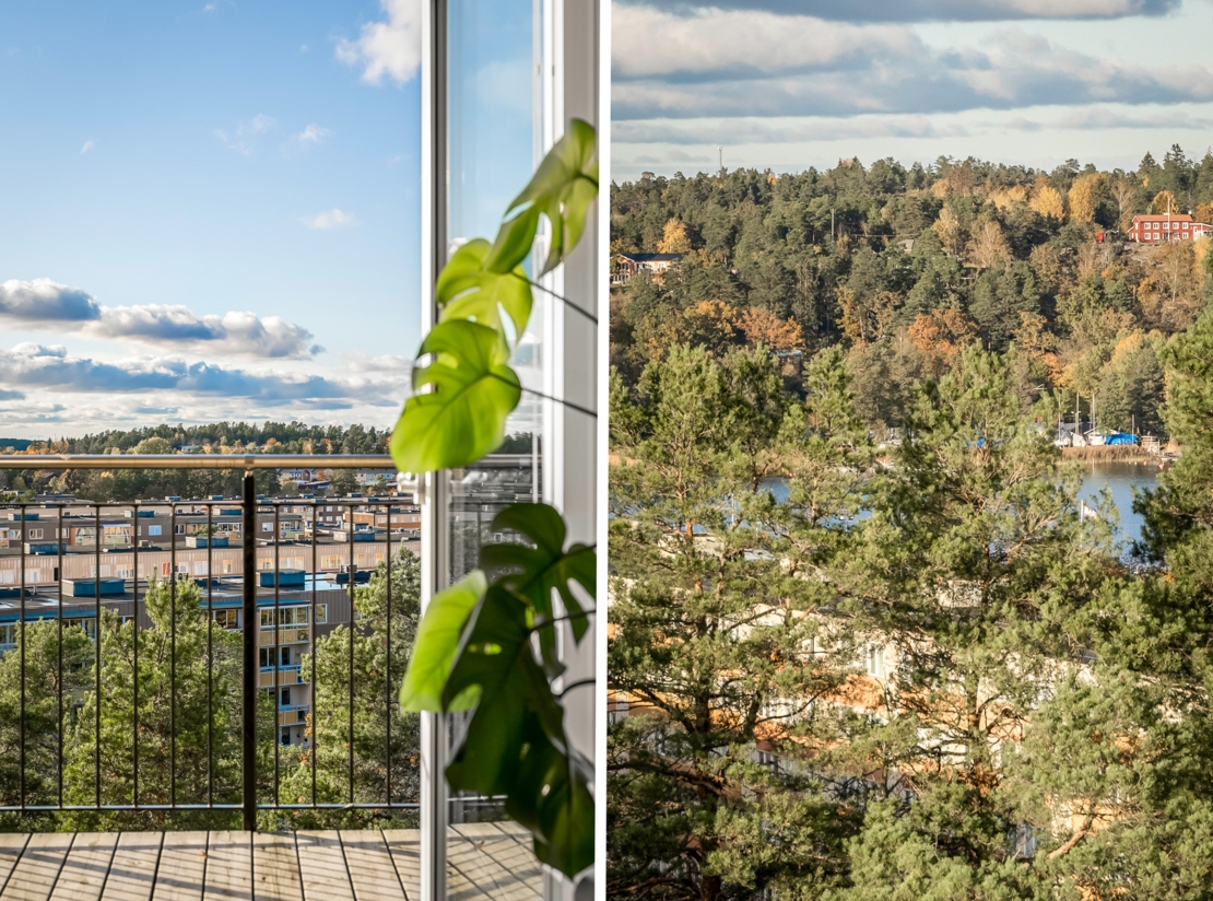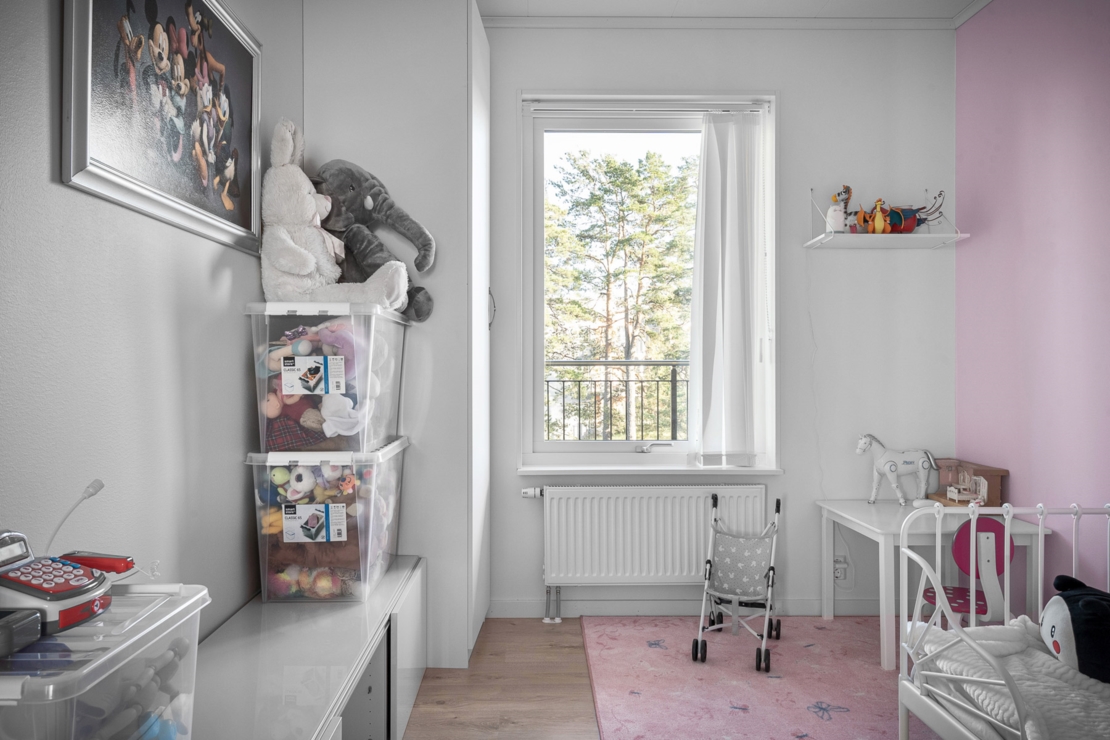 Ett rymligt sovrum med plats för dubbelsäng, sängbord och bra förvaring ligger till höger om vardagsrummet. Ytterligare två sovrum i anslutning till de sociala ytorna kan användas som barnrum eller hemmakontor. Samtliga sovrum är utrustade med ventilationssystem för optimal luftcirkulation och har datauttag för stabil internetuppkoppling. Balkongen, med sin magnifika vy över takåsar och Lännerstrasundet, blir en naturlig förlängning av vardagsrummet och en favoritplats under sommaren.