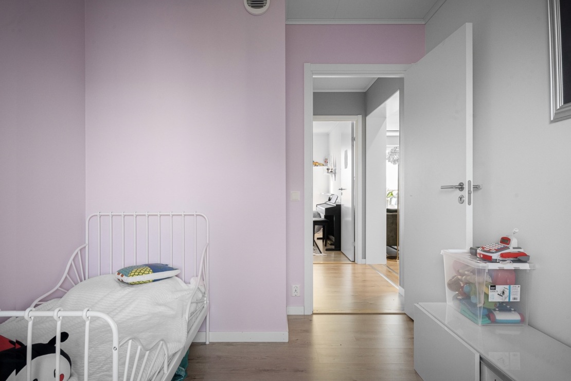 Det mindre sovrummet duger utmärkt för en barnsäng och lekhörna, samt har inbyggd förvaring. Rosa och vita väggar samt parkettgolv.