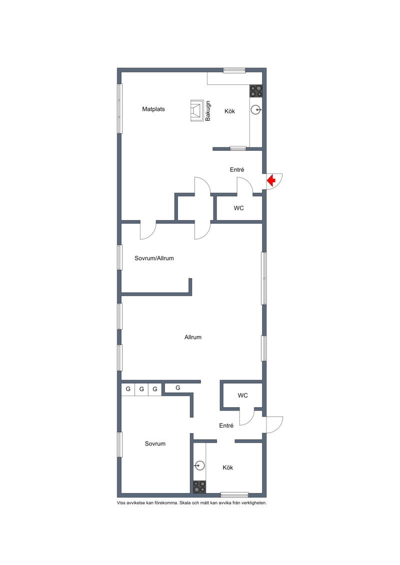 Bostaden karaktäriseras av stora, ljusa ytor och erbjuder flexibel planlösning med 1-2 sovrum. Huset innefattar två kök, två badrum och dubbla entréer, vilket möjliggör mångsidig användning.