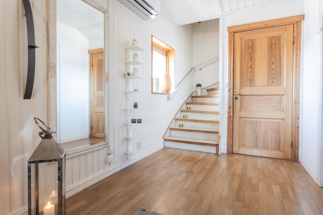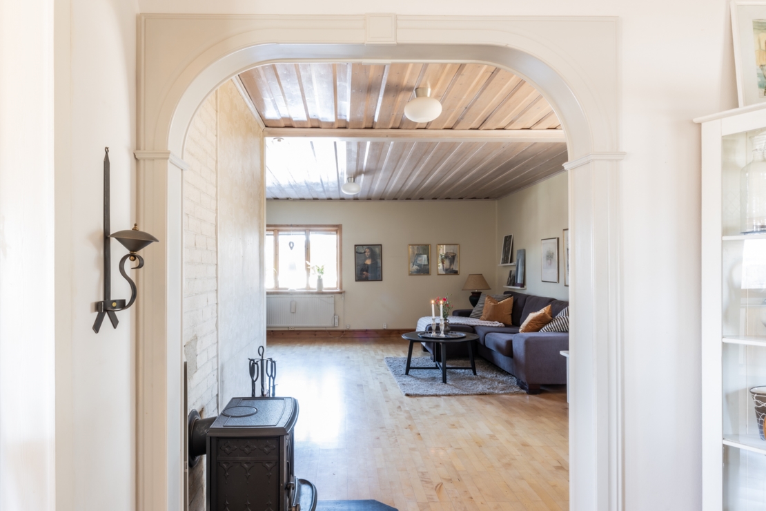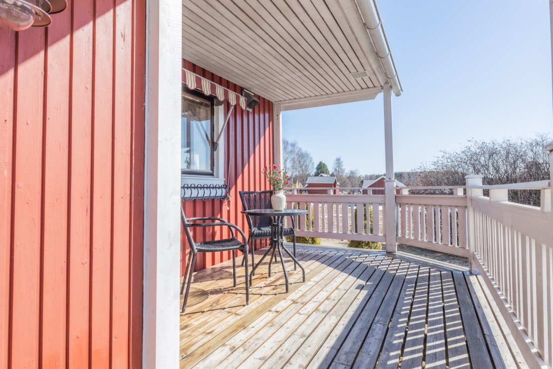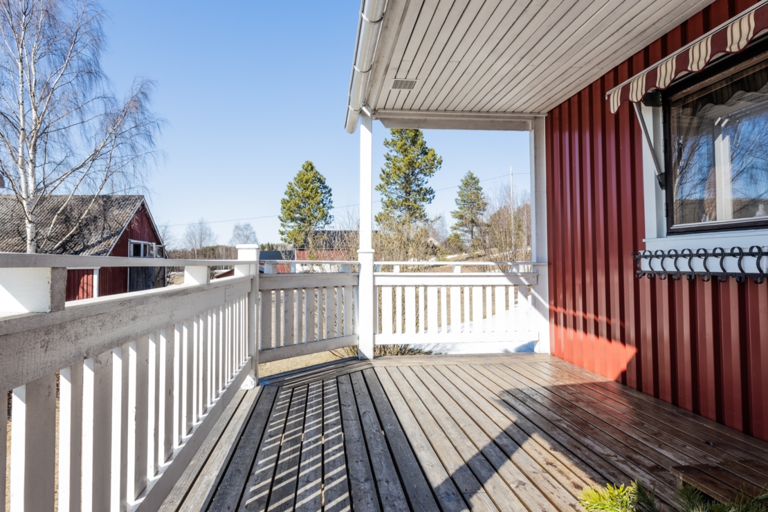 Huset har rymliga ytor och är perfekt för den som söker ett hem med både charm och funktionalitet. Entréplanet har en öppen planlösning med ett välutrustat kök och matplats, ett stort vardagsrum med en ny braskamin (installerad 2023), och ett fräscht badrum med dusch och toalett. En stor altan sträcker sig längs husets framsida och erbjuder en fantastisk vy över den välskötta trädgården och älven.