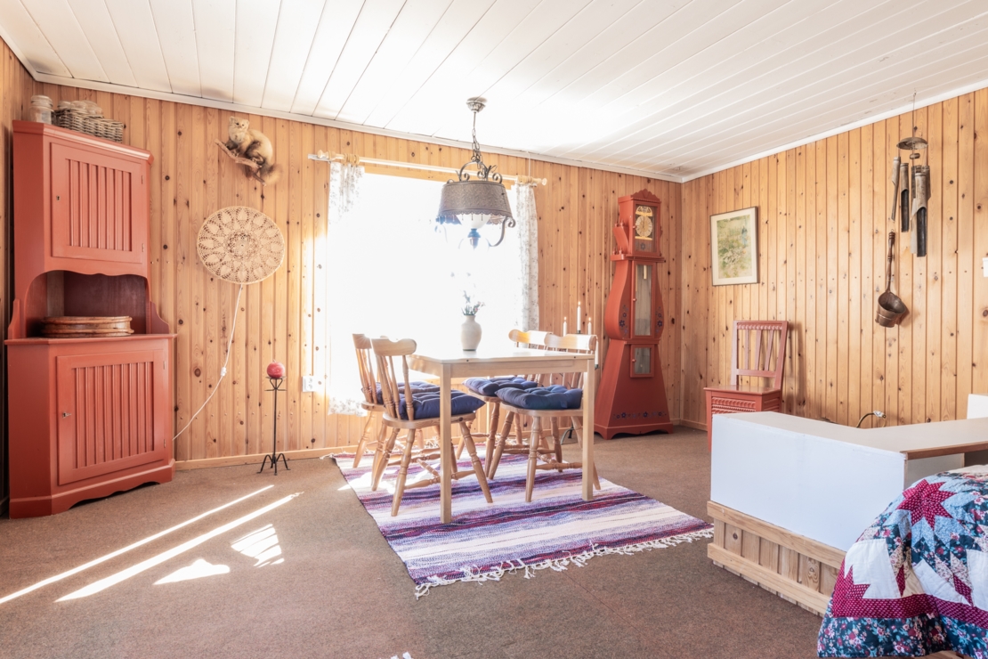 En charmig timrad stuga med isolering och 2-glasfönster, idealisk för gäster eller som sommarstuga. Samma byggnad har även ett traktorgarage.