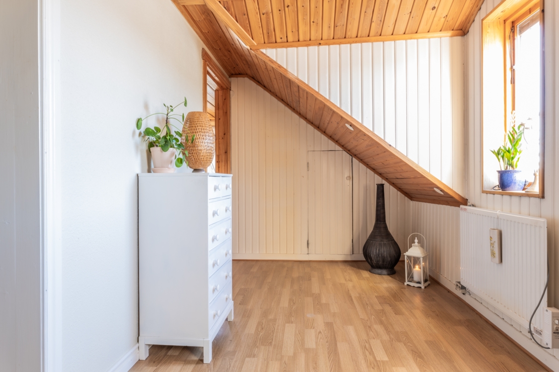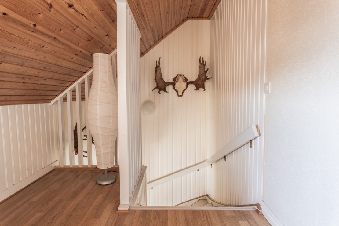 På övre plan finns två stora sovrum, ett mindre sovrum, en toalett och en balkong som även den erbjuder en magnifik utsikt över Kalixälven. Källaren rymmer en bastu med dusch, toalett, matkällare, verkstad/hobbyrum och flera rum för förvaring eller hobbyverksamhet. Snabbt internet är säkrat med indraget fiber.