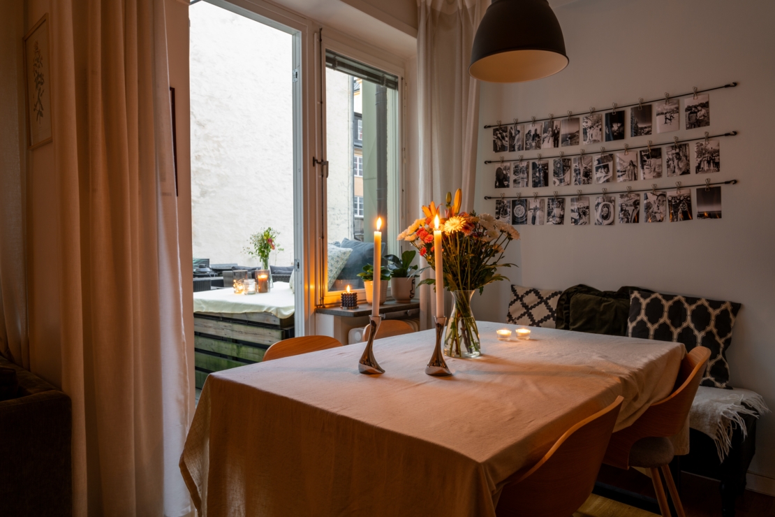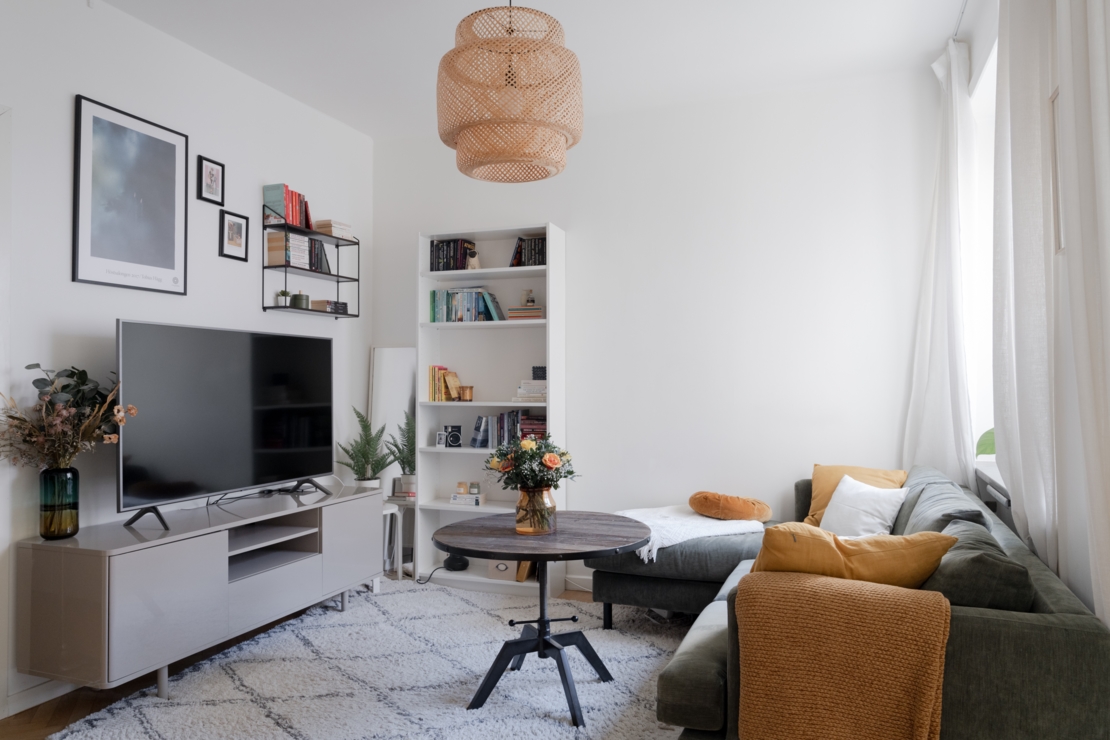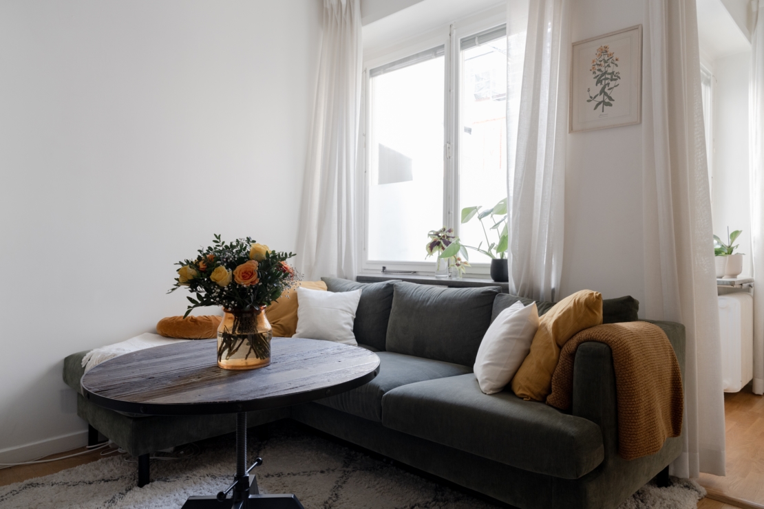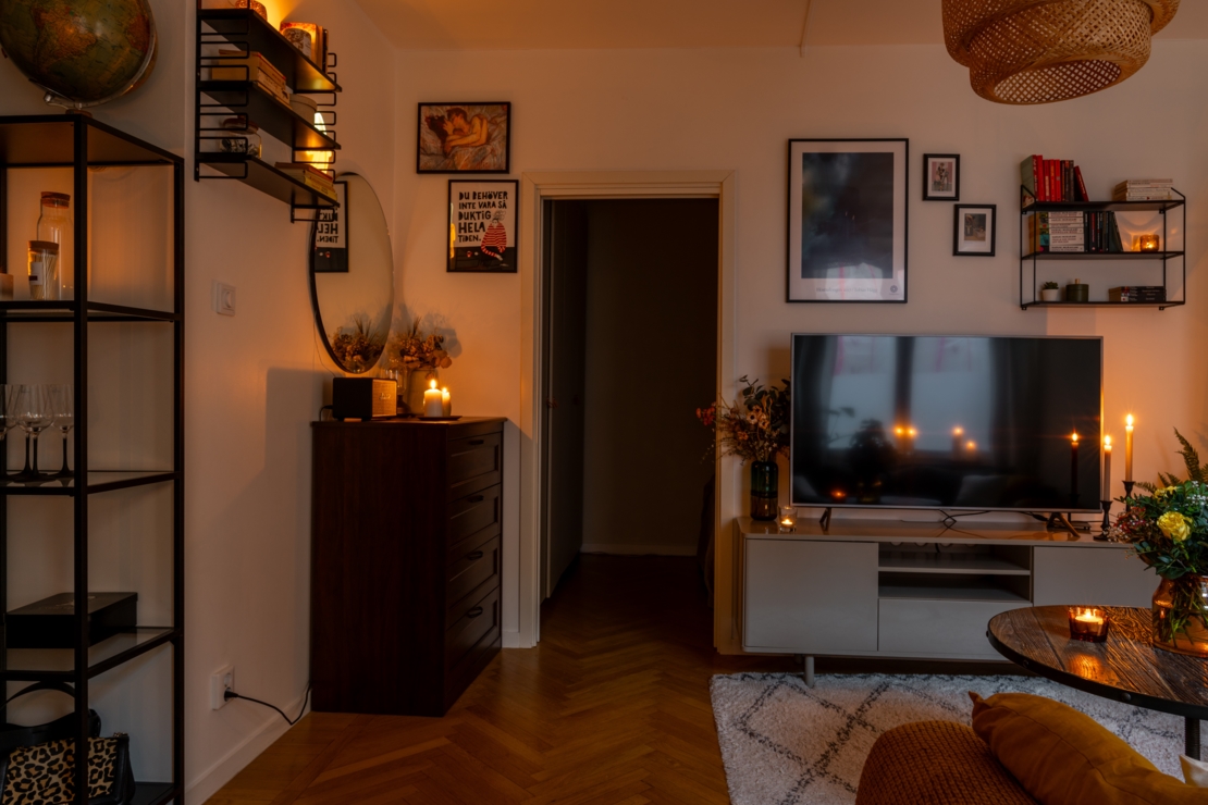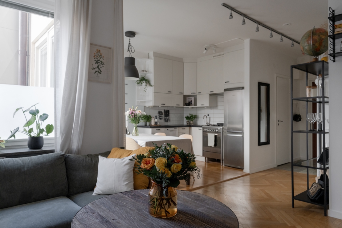 Vardagsrum med plats för soffgrupp med tillhörande möblemang.