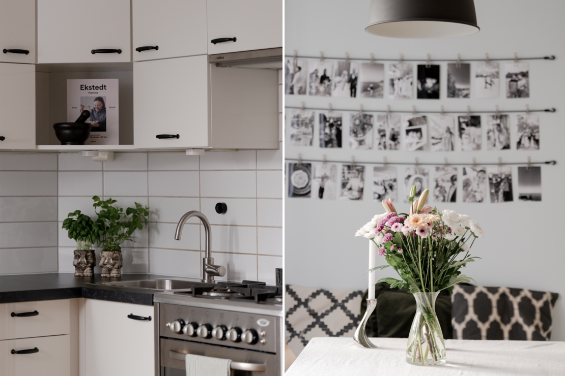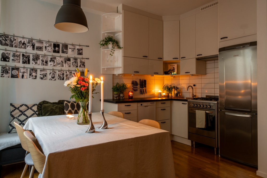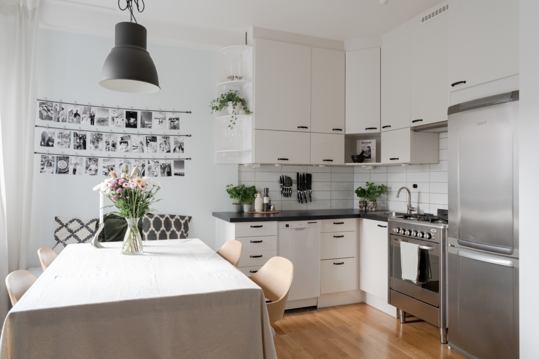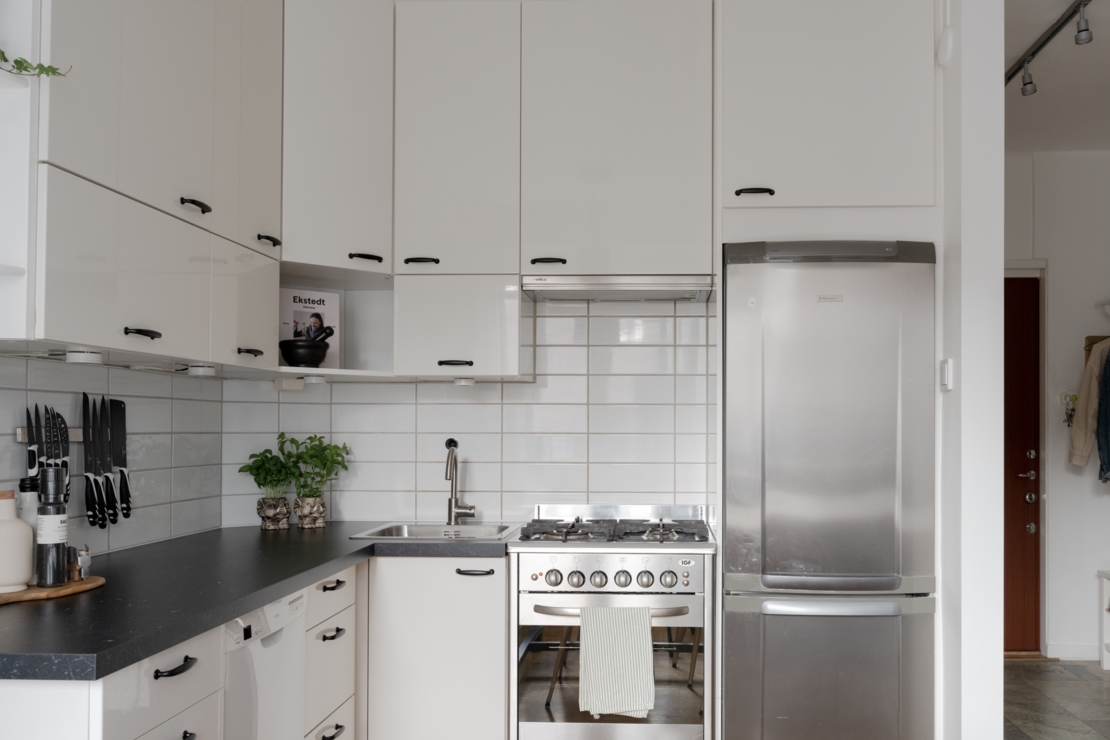 Stilrent kök med ljusa skåpluckor och mörk arbetsbänk. Köket är maskinellt utrustat med spis, ugn, fläkt, diskmaskin samt kyl/frys. Öppen planlösning mot vardagsrummet.