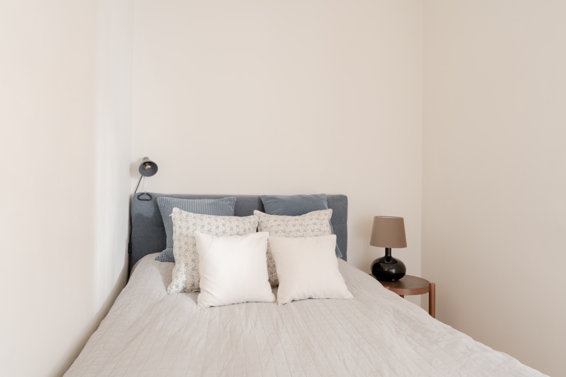 Rofyllt sovrum med trägolv och ljusa väggar. Generös förvaring i praktiska garderober.