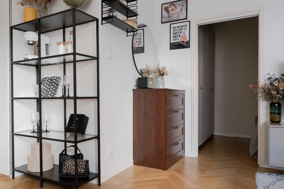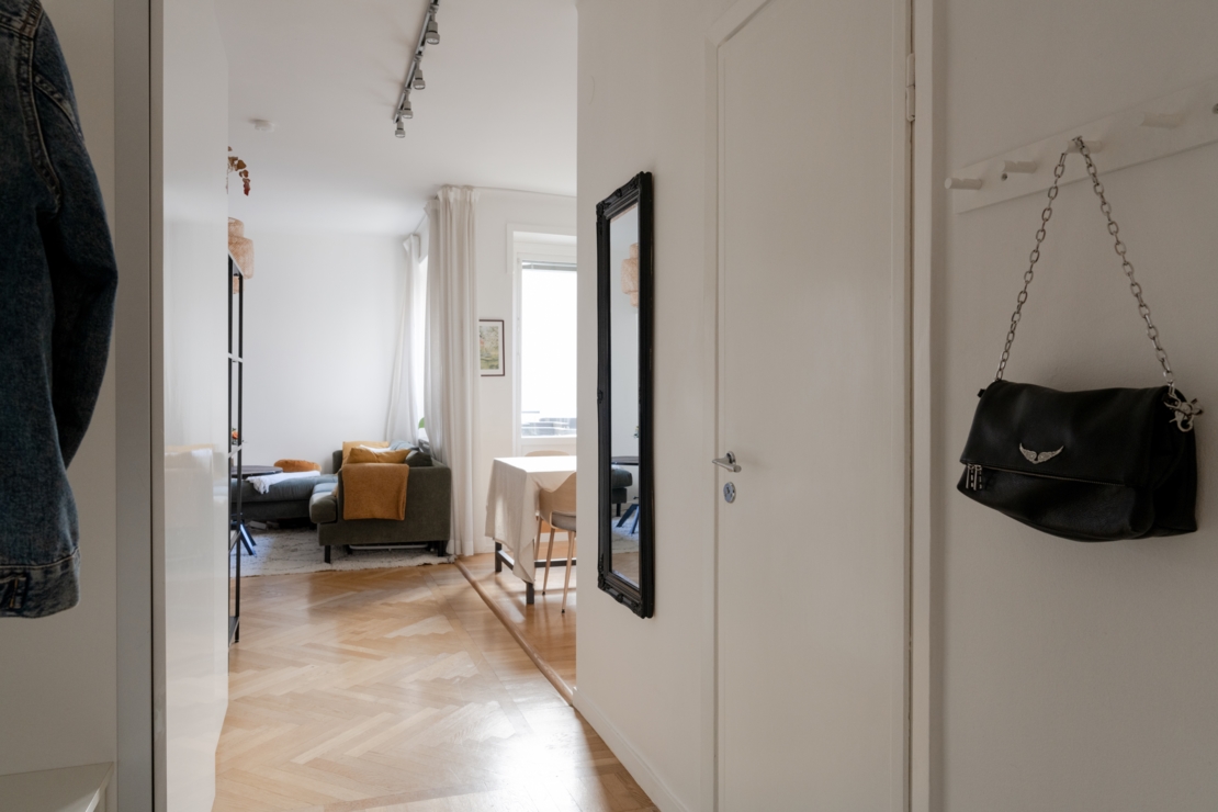 Välkomnande hall med kolmårdsmarmor och ljusa väggar. Plats för avhängning vid hatthylla samt plats för hallmöbel.