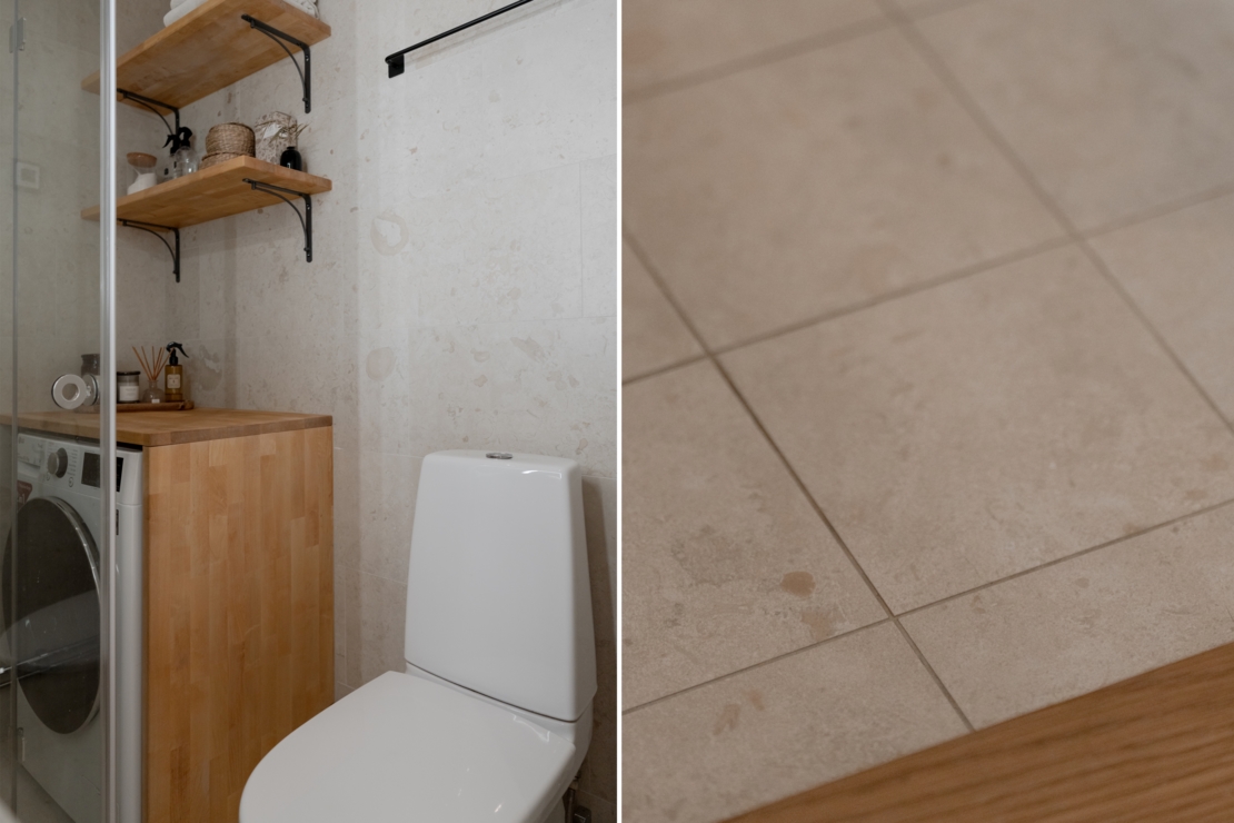 Helkaklat badrum inrett med golvvärme, wc, kommod, handdukstork, kombimaskin samt dusch med glasväggar. Infällda spotlights i tak.