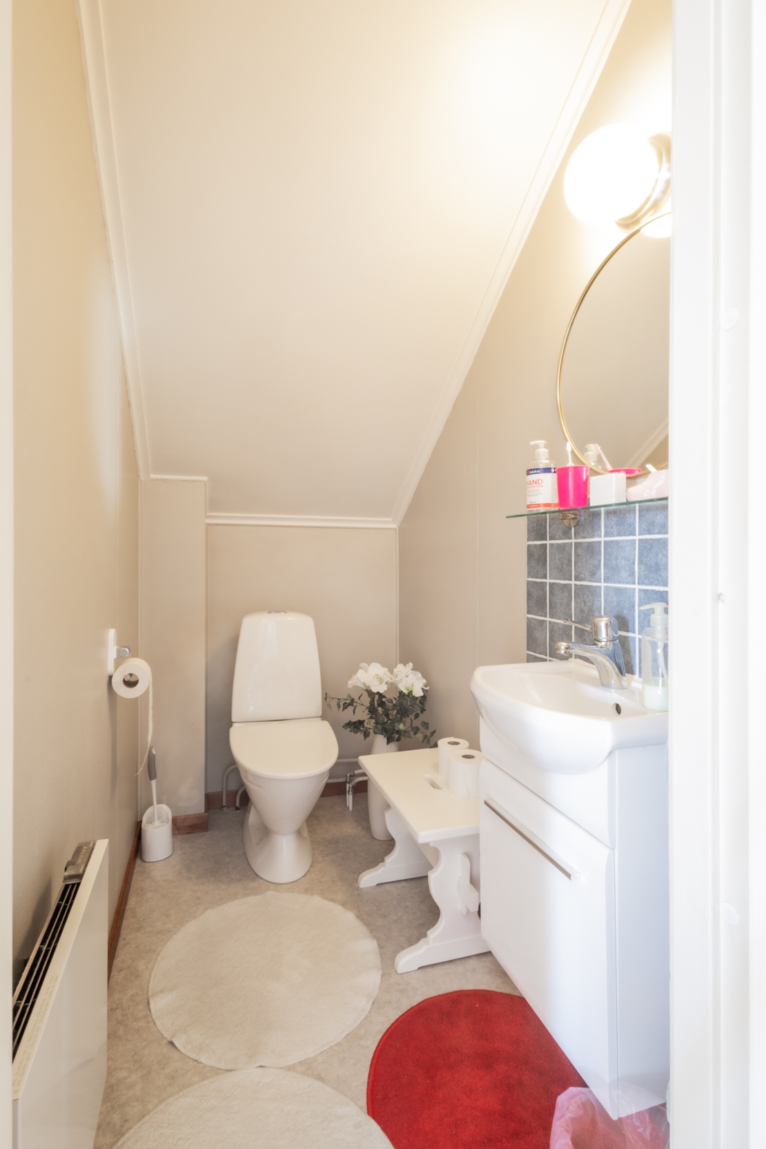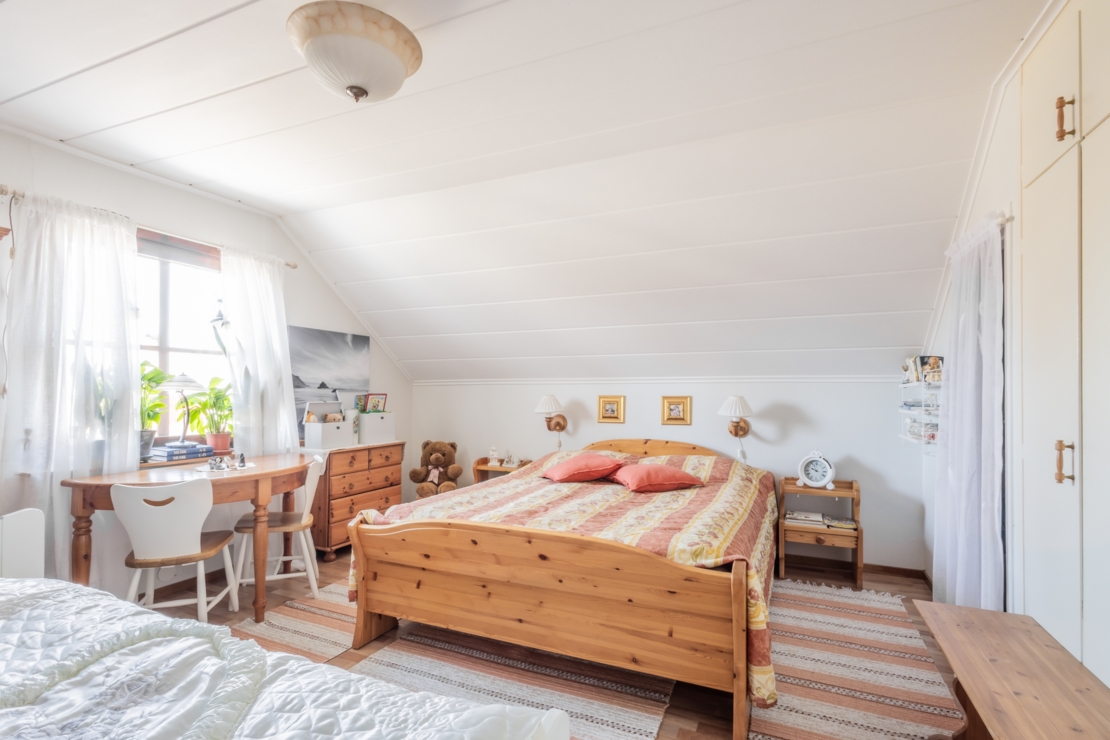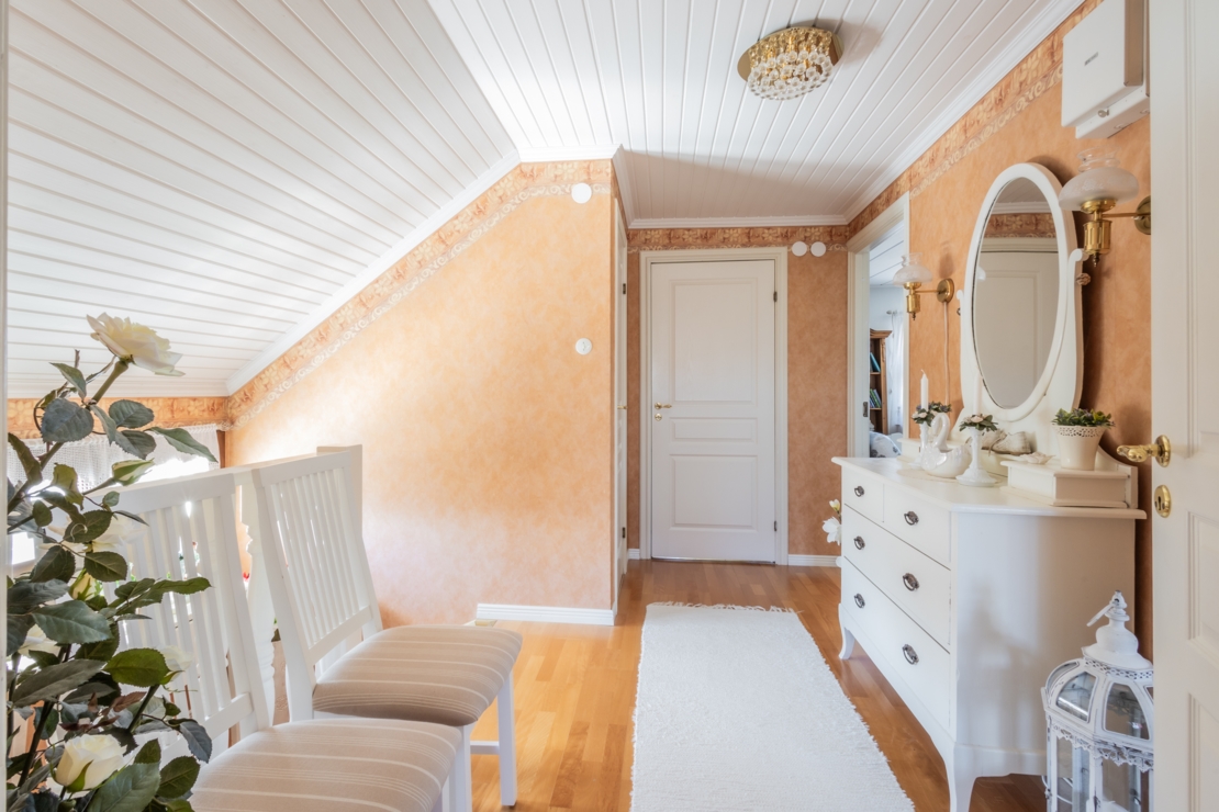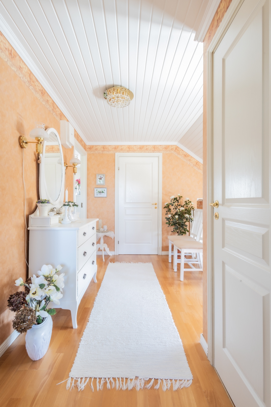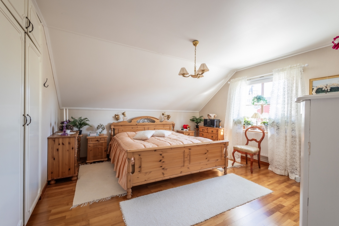 Övre plan rymmer fyra trevliga sovrum – alla med garderober – en luftig hall samt en extra toalett.