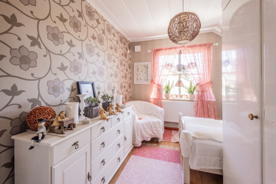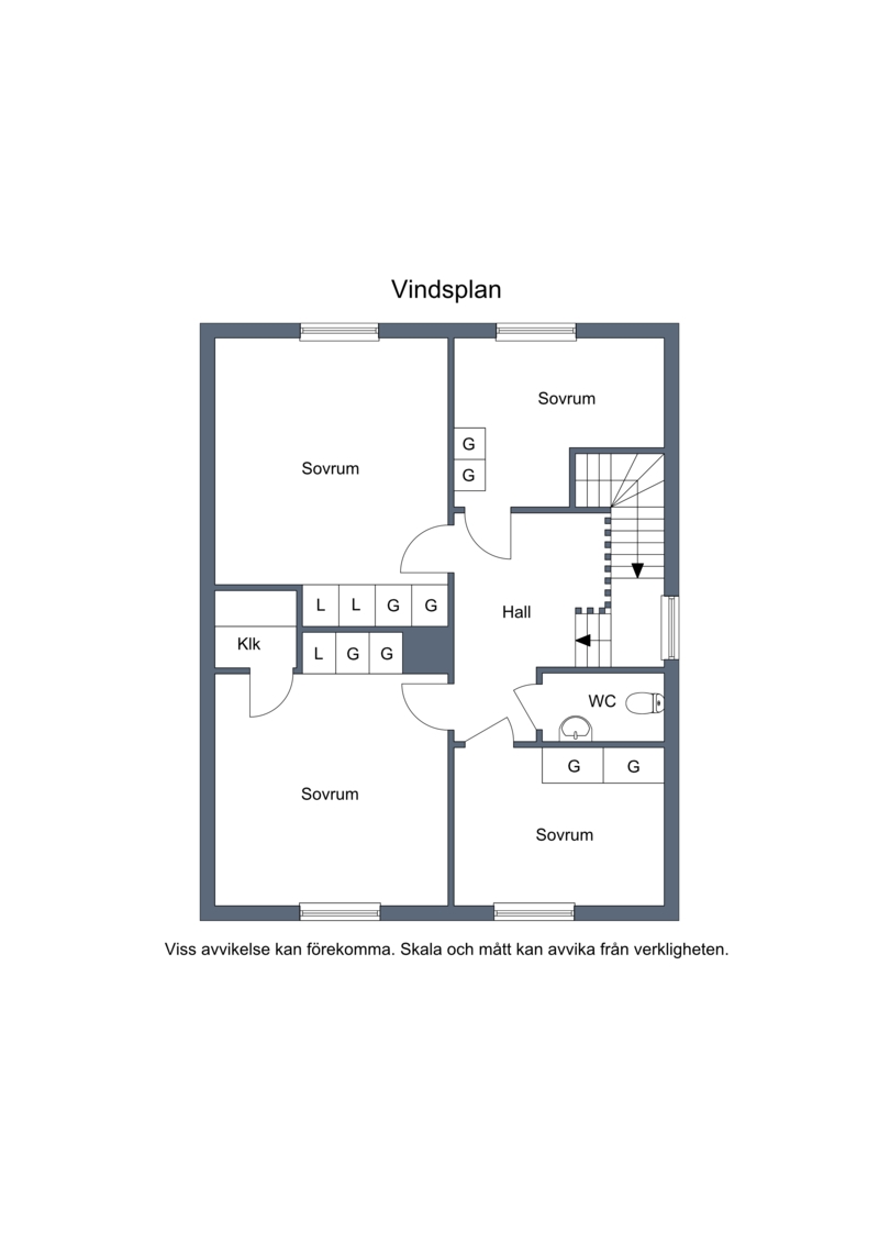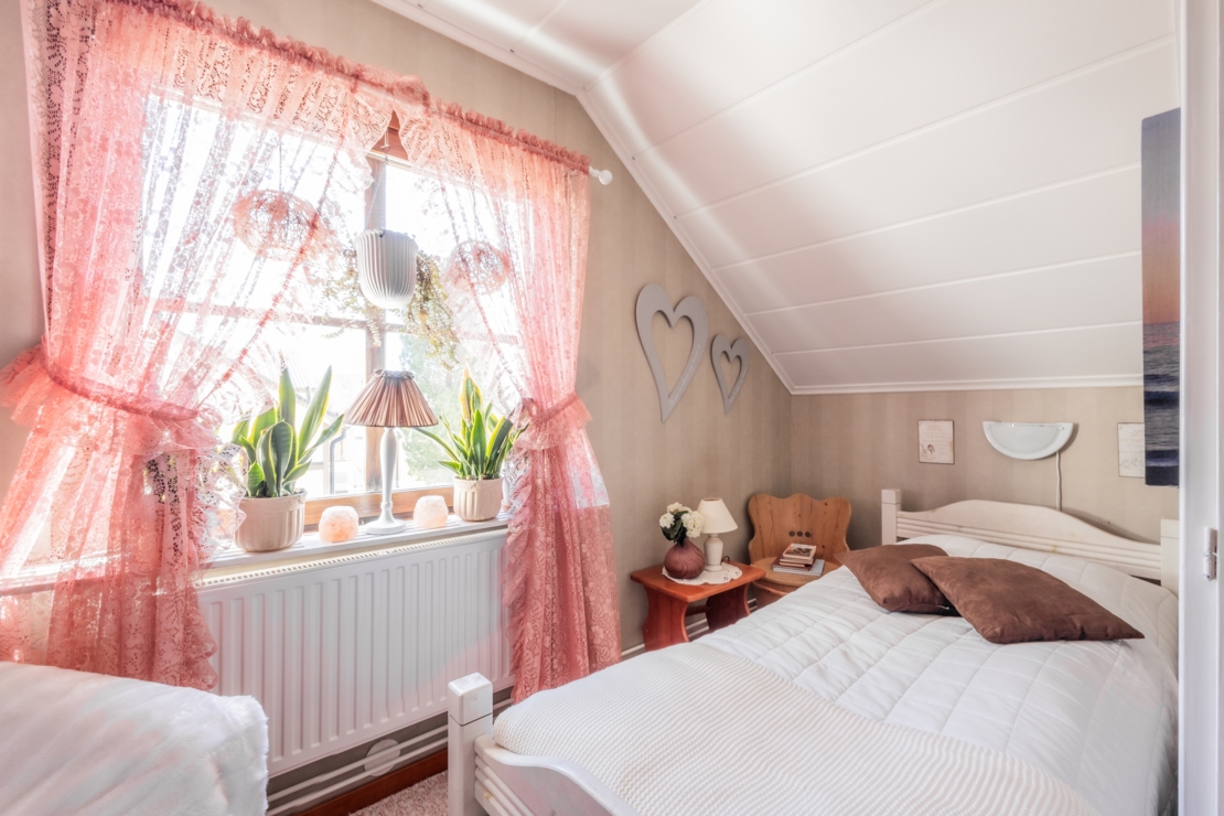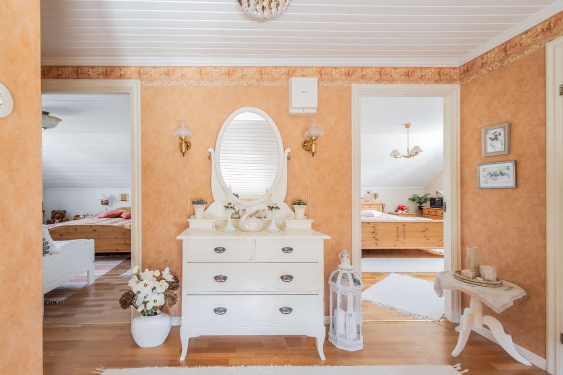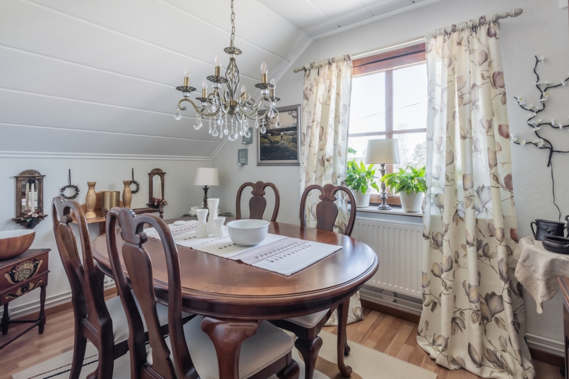 Övre plan rymmer fyra trevliga sovrum – alla med garderober – en luftig hall samt en extra toalett.