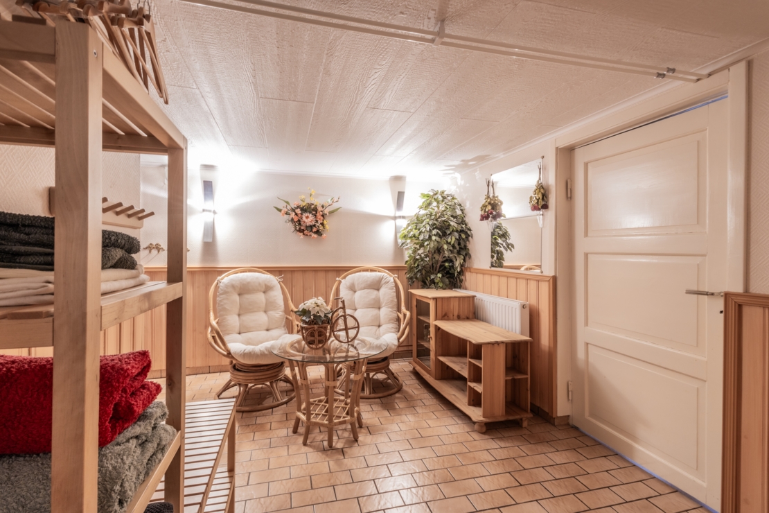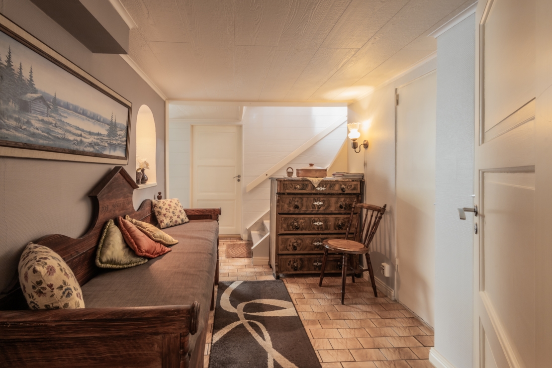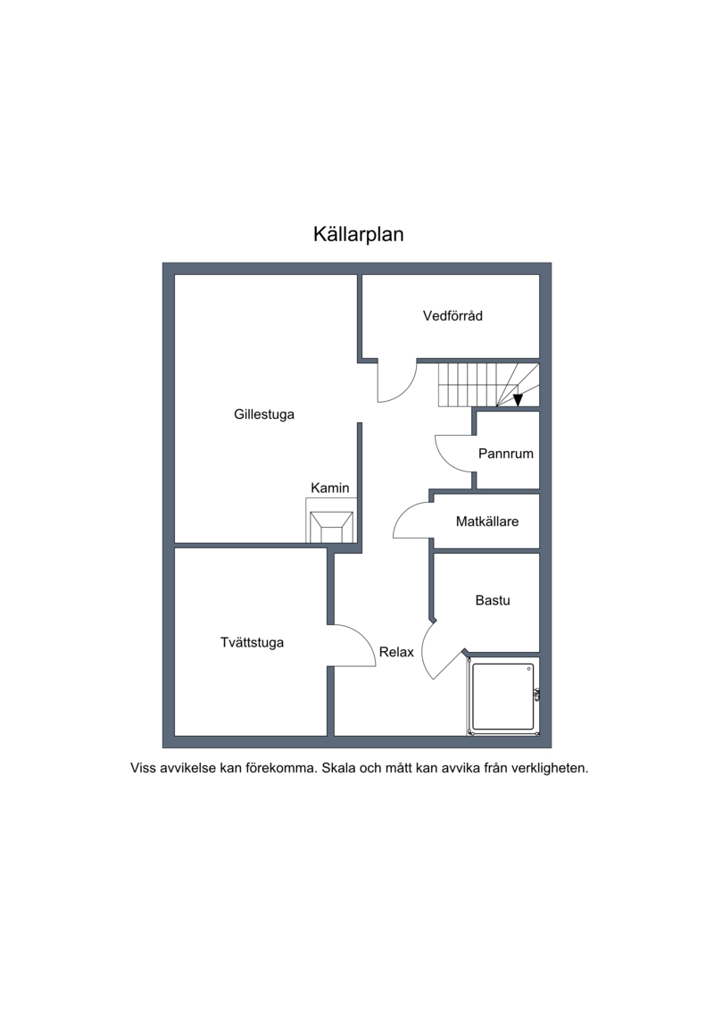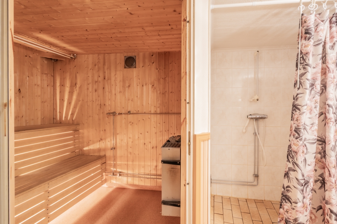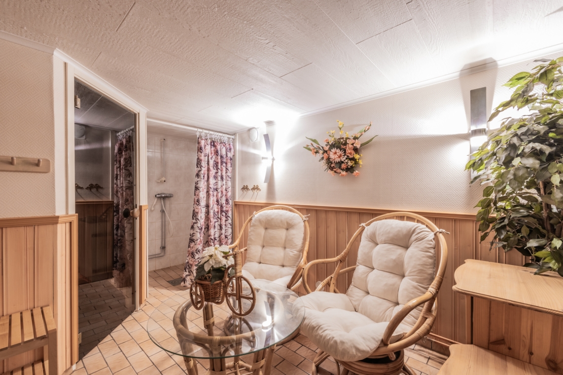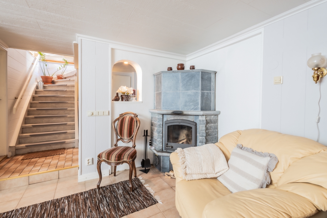 Källarvåningen är smakfullt inredd och rymmer en gillestuga med klinkergolv och en stor Tulikivi täljstensugn som ger extra komfort. I anslutning finns en hall och relaxavdelning med golvvärme samt klinkergolv, kaklad dusch, bastu med våtrumsmatta. Dessutom finns tvättstuga, matkällare och vedförråd.
