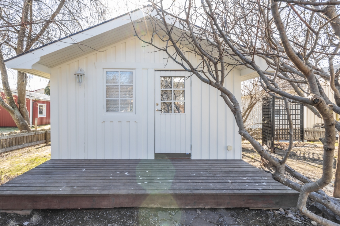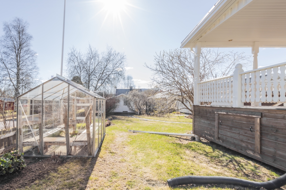 Från entréplanet når du en härlig, cirka 21 kvm stor altan i sydvästläge – under tak – där du kan njuta av sköna sommarkvällar med utsikt över den prunkande, välskötta trädgården.
