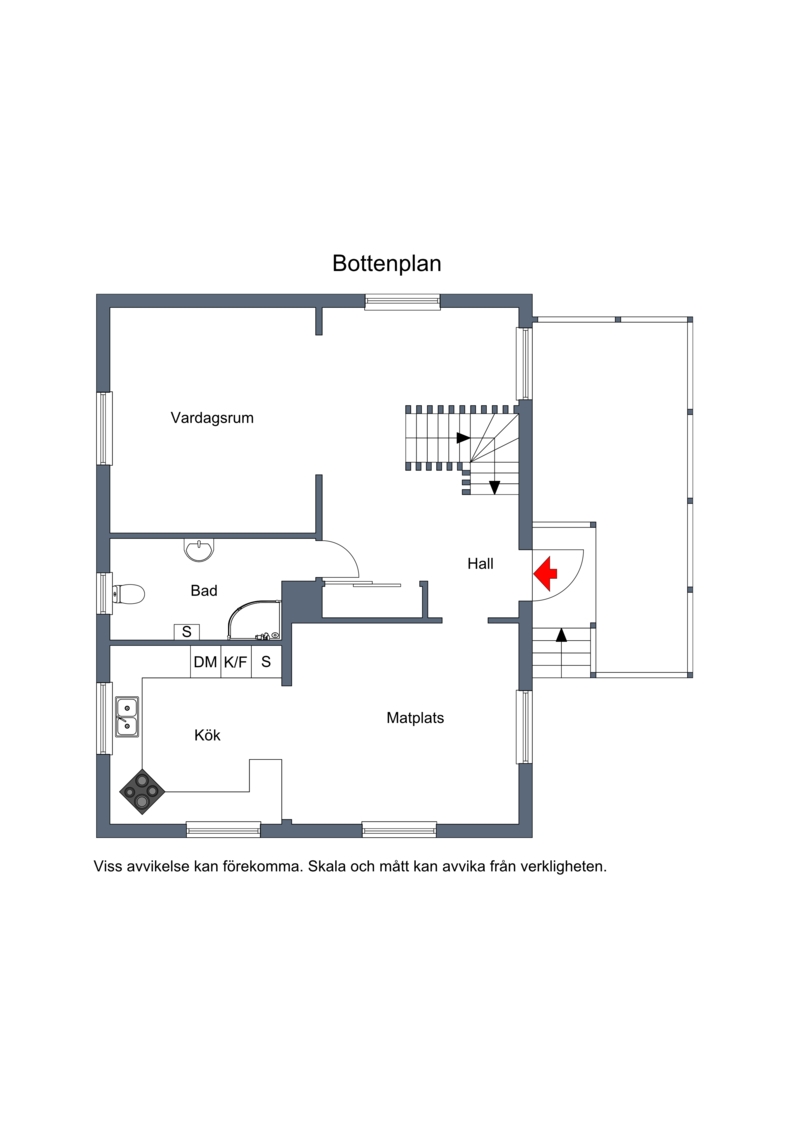 Entréplan erbjuder en välkomnande hall, ett ljust och trivsamt vardagsrum samt ett exklusivt Ballingslöv-kök med integrerad kyl, frys mikro och diskmaskin. Intill köket ligger ett rymligt matrum – perfekt för familjemiddagar eller sociala tillställningar. Här finns även ett stort badrum med kaklade väggar, dusch och WC.