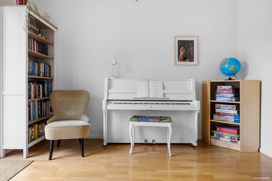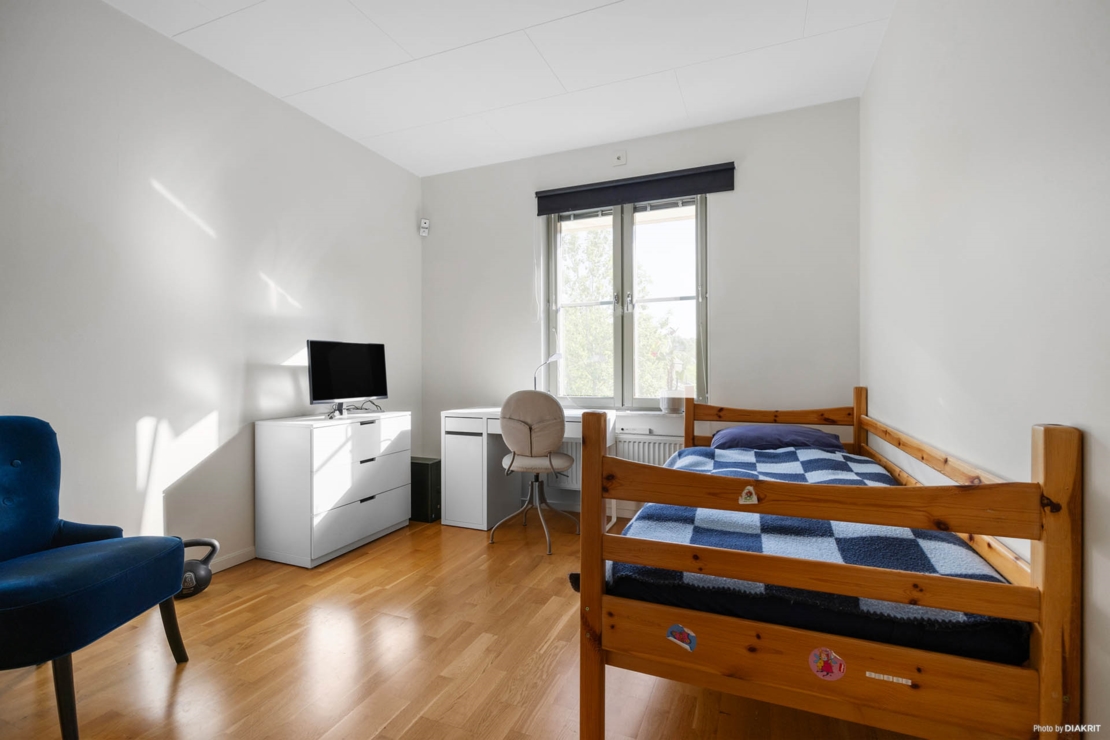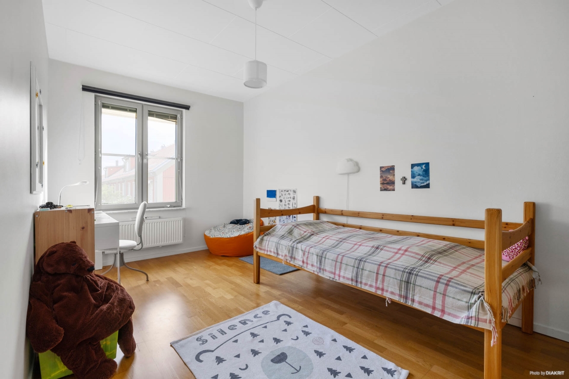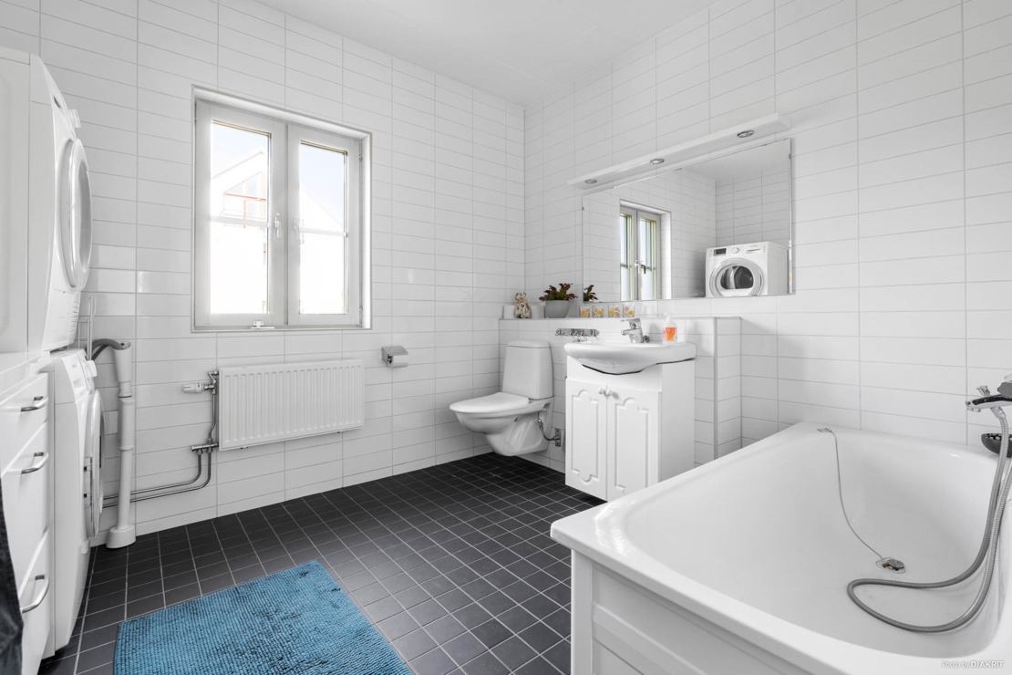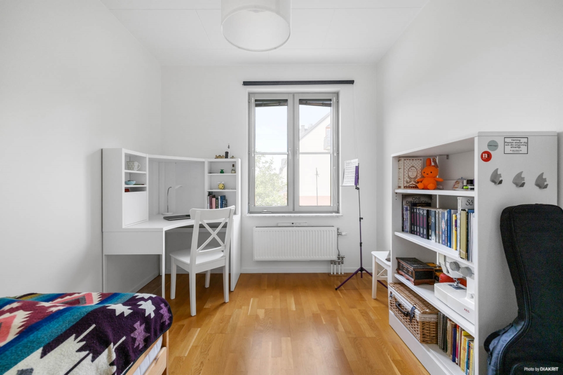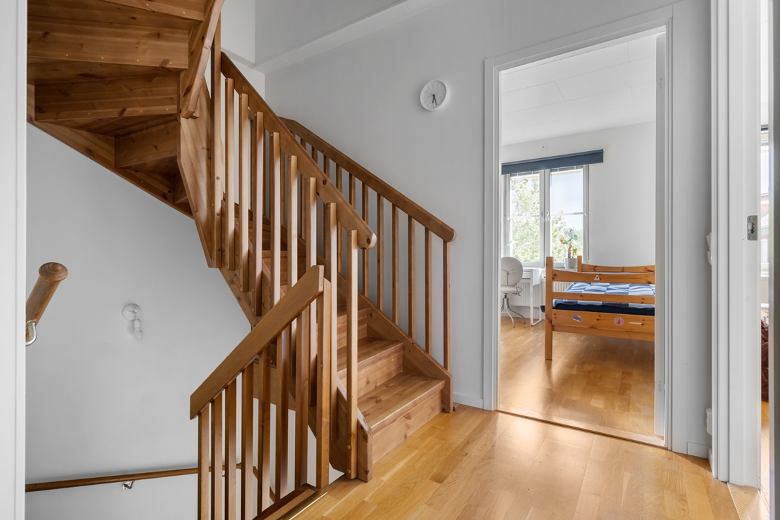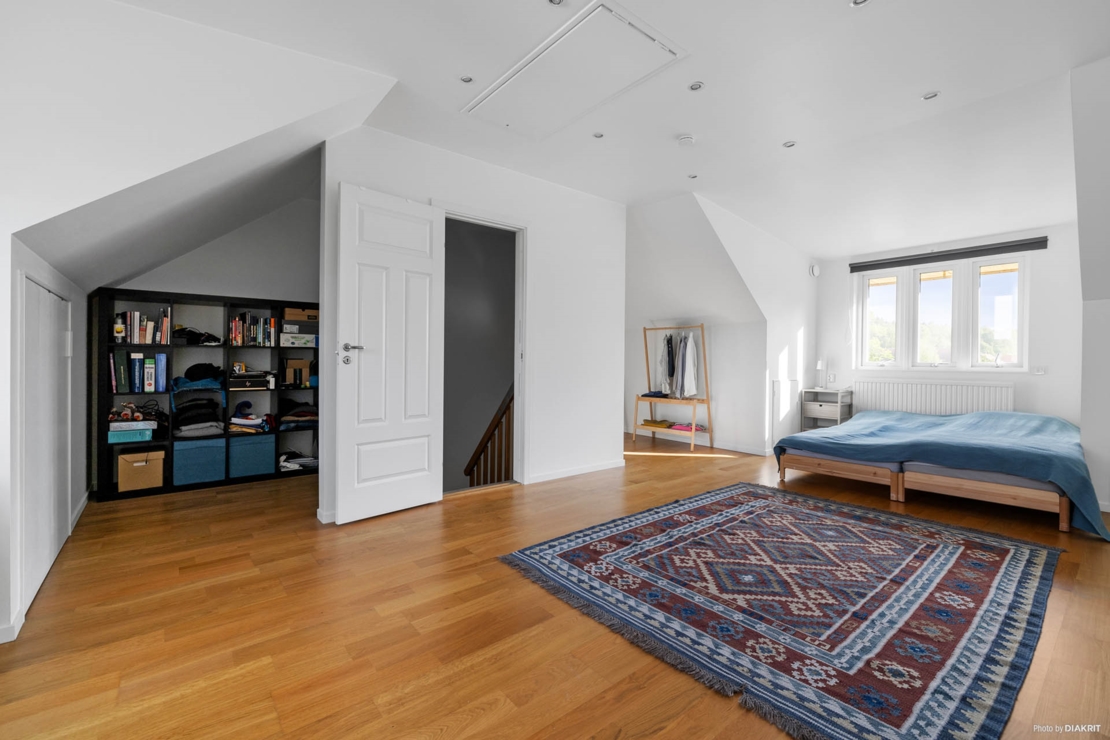 På övre plan väntar tre rymliga sovrum om ca 10, 11 och 13 kvm – samtliga med tillhörande klädkammare. Här finns gott om plats för både barn och deras övernattande vänner. Intill sovrummen ligger ett generöst badrum med tvättavdelning, utrustat med badkar, tvättmaskin, torktumlare, strykmöjligheter och rikligt med naturligt ljusinsläpp.