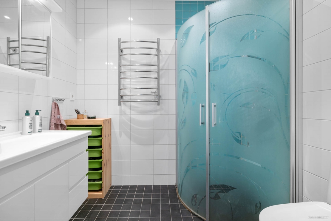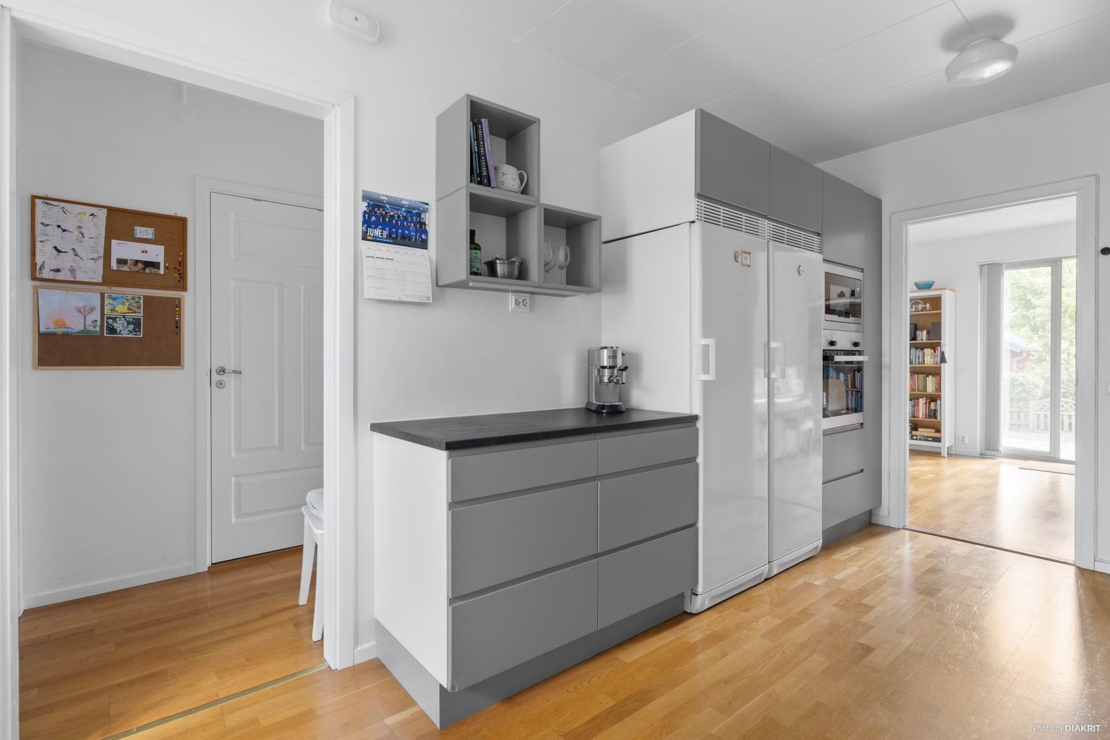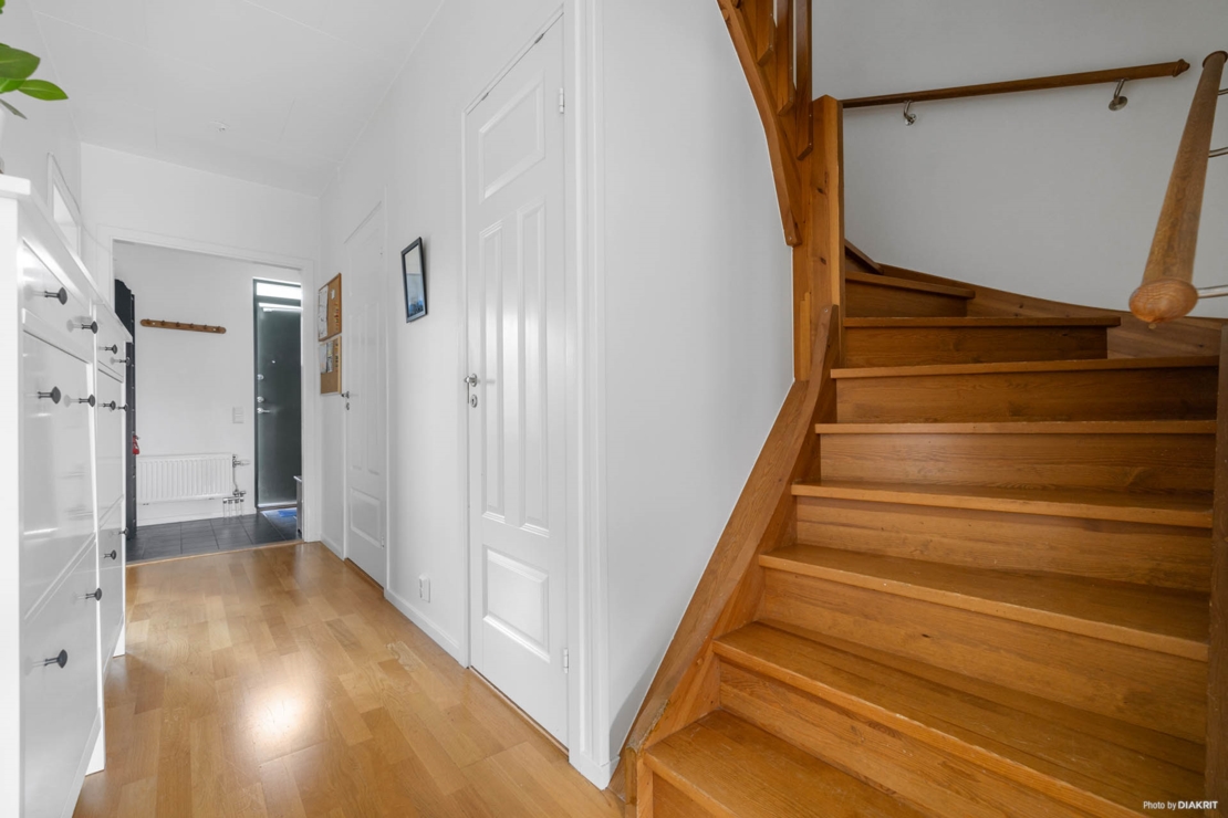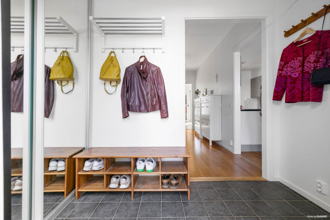 På entréplanet möts du av ett praktiskt kapprum med generös förvaring i garderober, ett fräscht badrum utrustat med dusch och toalett, samt en smart klädkammare belägen under trappan – perfekt för dold förvaring.