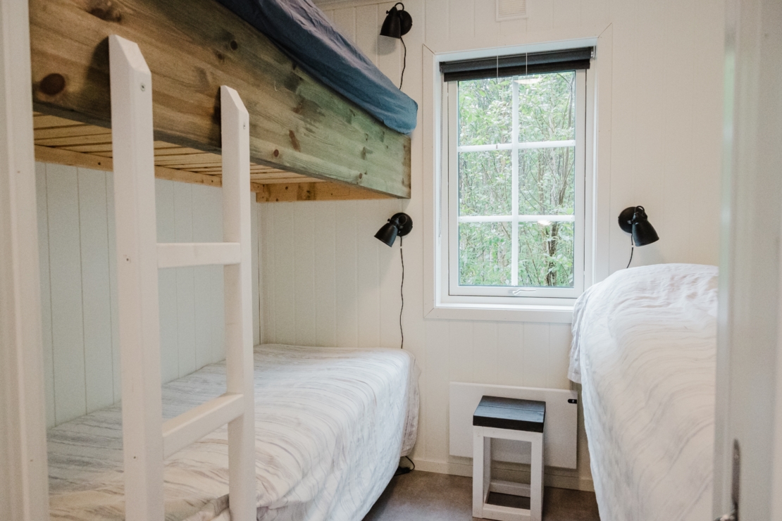 Rofyllt sovrum med plastgolv och ljusa väggar. Här finns platsbyggd våningssäng och en enkelsäng.