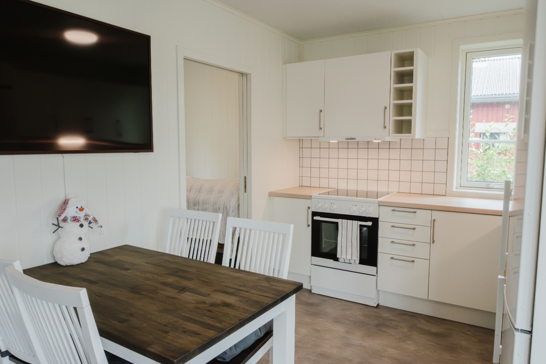 Stilrent kök med ljusa skåpluckor och kakel ovanför arbetsbänk. Köket är maskinellt utrustat med spis, ugn, fläkt, diskmaskin samt kyl/frys. Plats för matbord för sällskap om ca 4 personer.