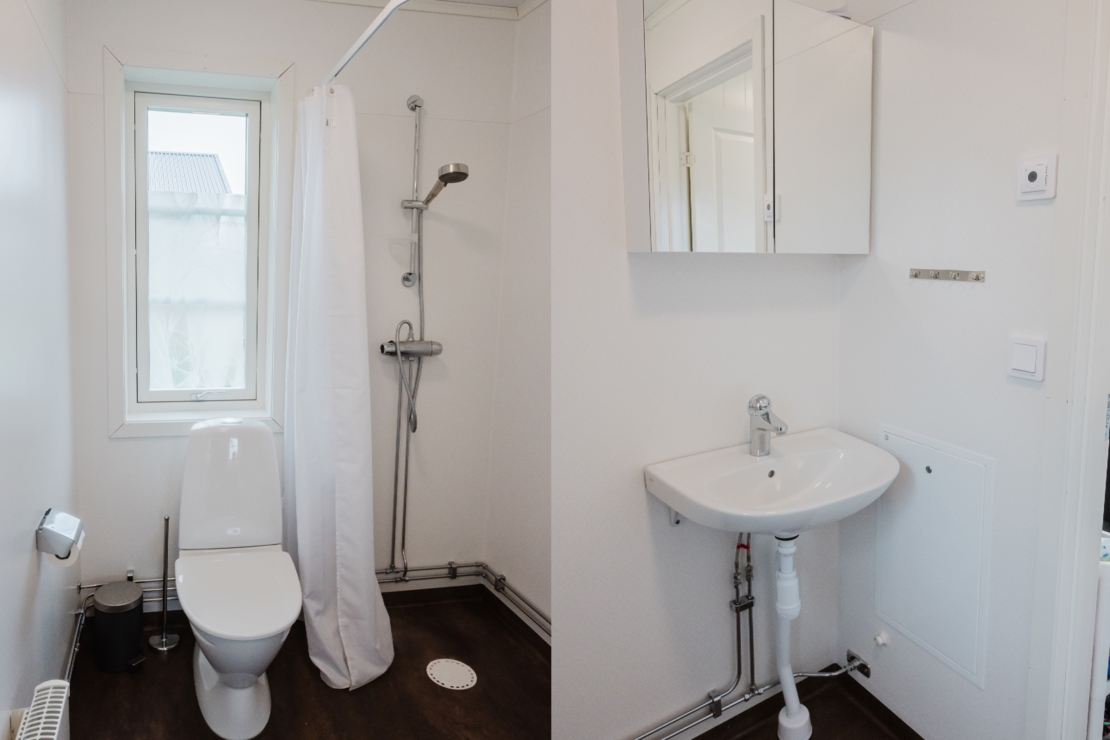 Badrum inrett med wc, handfat, dusch och förvaring i överskåp med spegel.